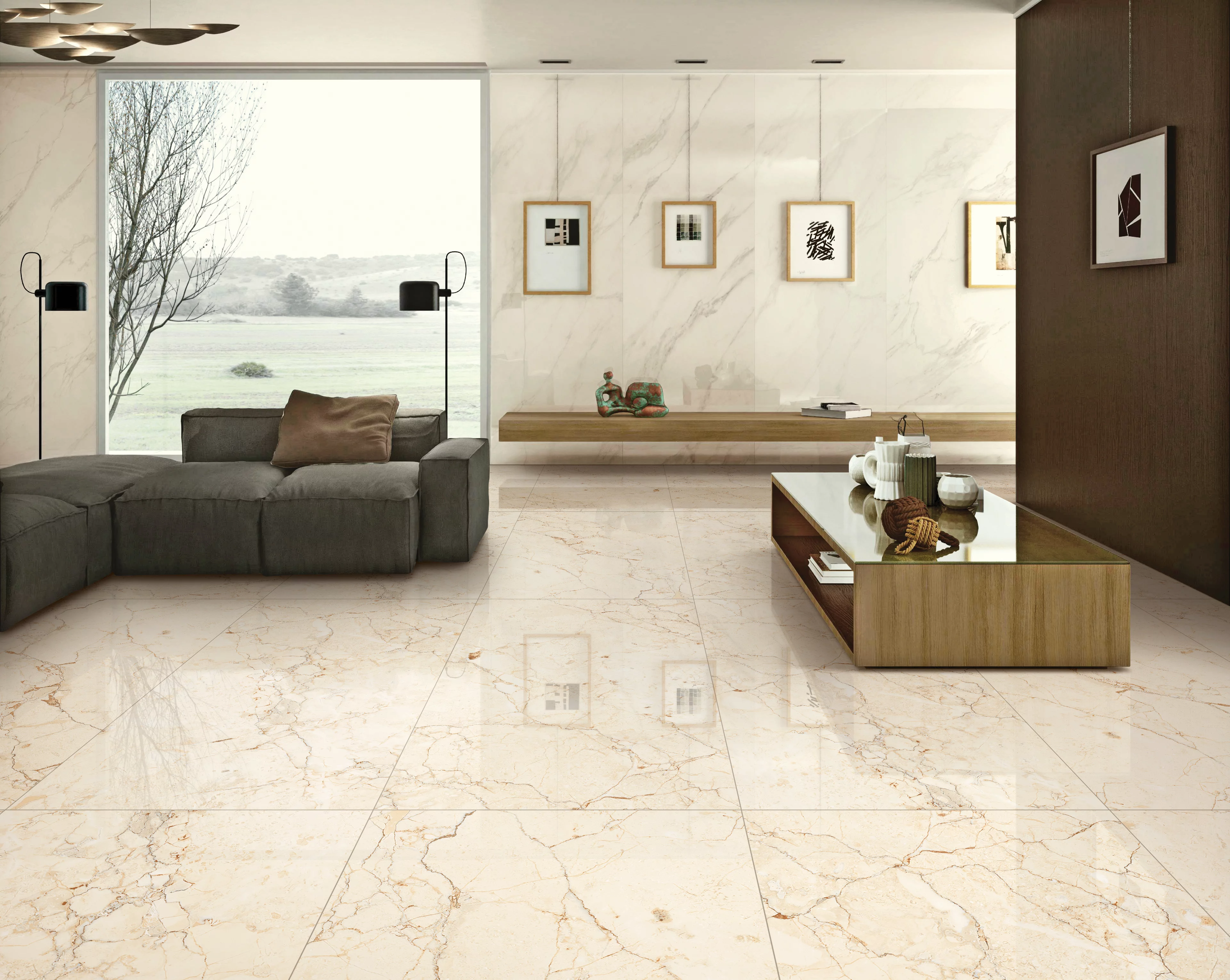 GRESIE ELEGANT ROSALIANO GRANDE - 60X120 cm, porțelanată lucioasă, model marmură în nuanțe calde, rectificată, potrivită pentru interioare elegante și luminoase.