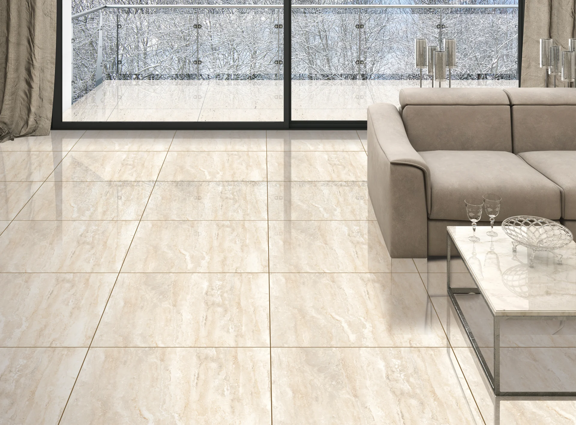 GRESIE MILANO CREMA - 80X80 cm, porțelanată, lucioasă, rectificată, aspect de travertin natural în nuanțe calde de crem-bej deschis, ideală pentru interioare luminoase și moderne.