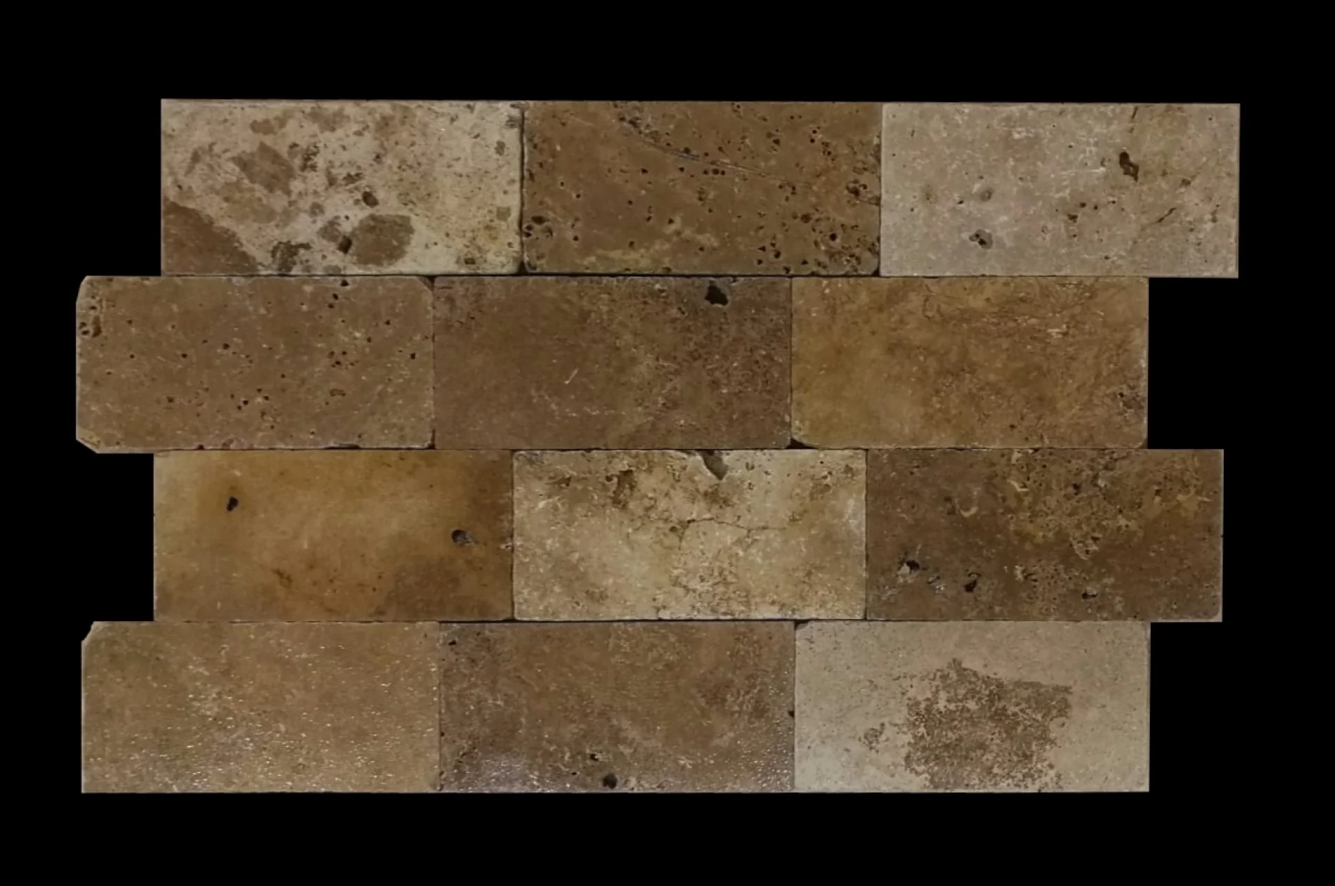 TRAVERTIN NOCHE ANTIQUE MIX - 15.2X30.5X1 cm, finisaj antichizat (tumbled), în nuanțe variate de maro, ideal pentru amenajări rustice și mediteraneene.