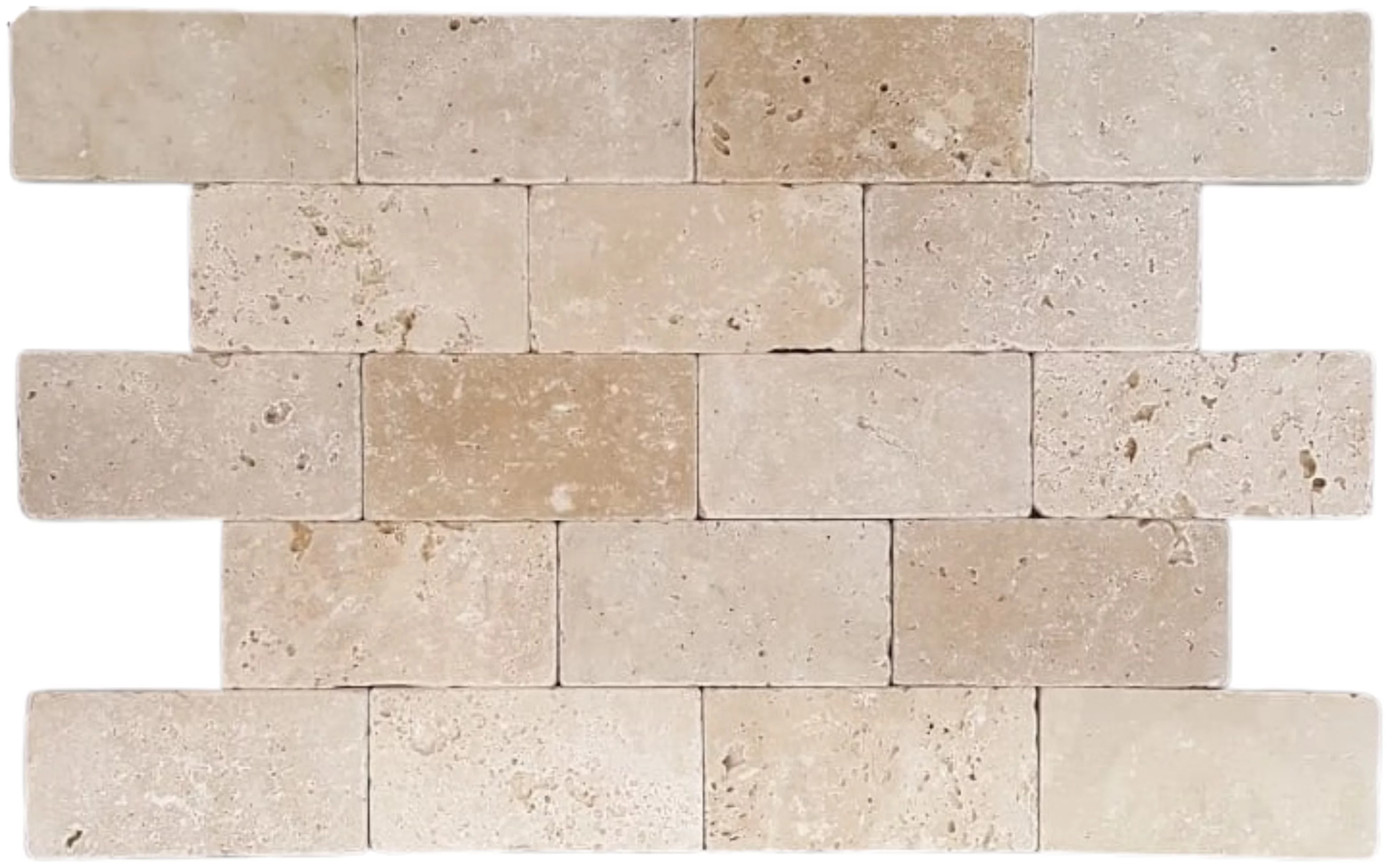TRAVERTIN LIGHT - 7.5X15X1 cm, cu finisaj tumbled, în nuanțe calde de crem și bej, ideal pentru decorarea pereților și pardoselilor cu un aspect rustic și elegant.