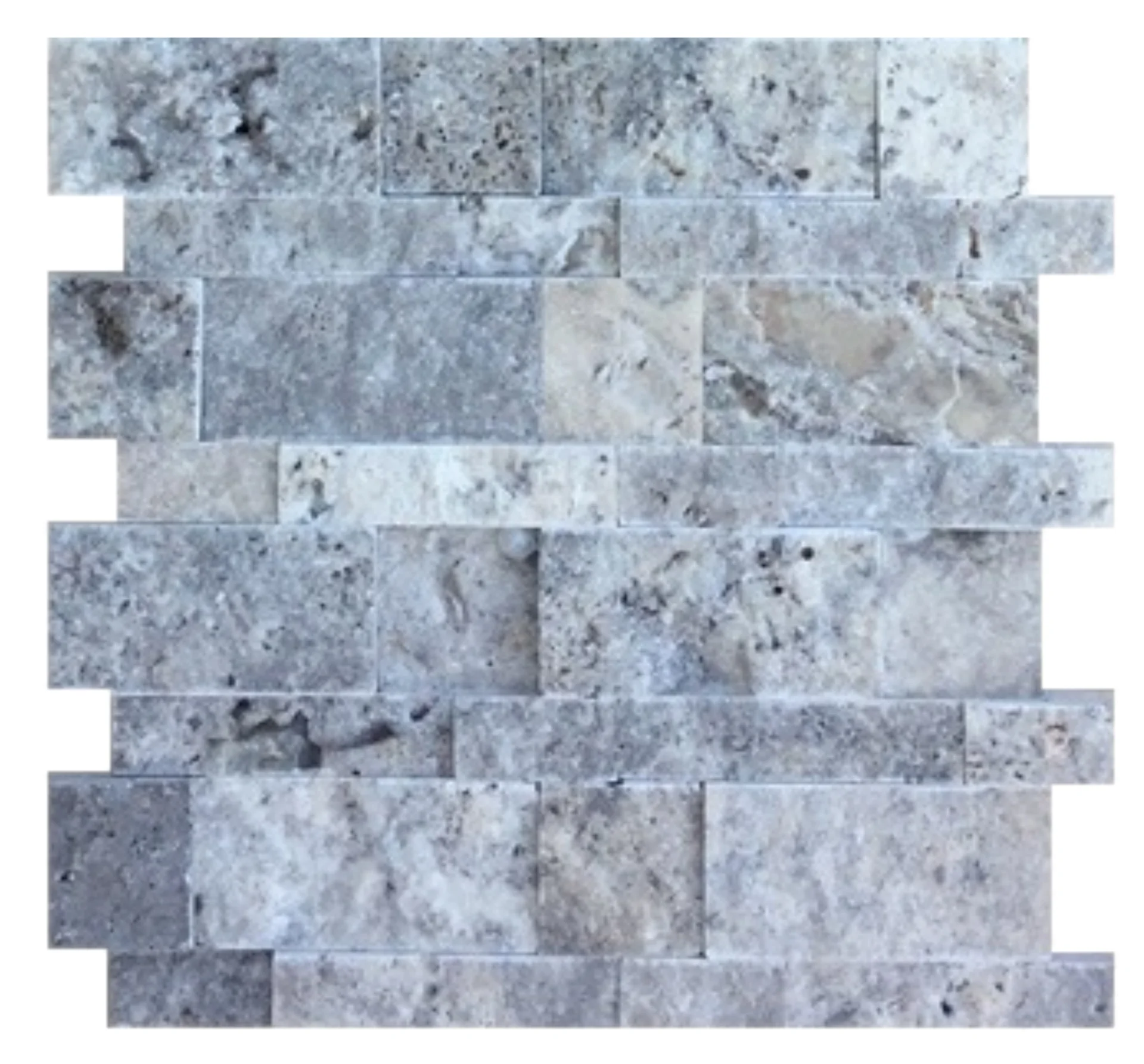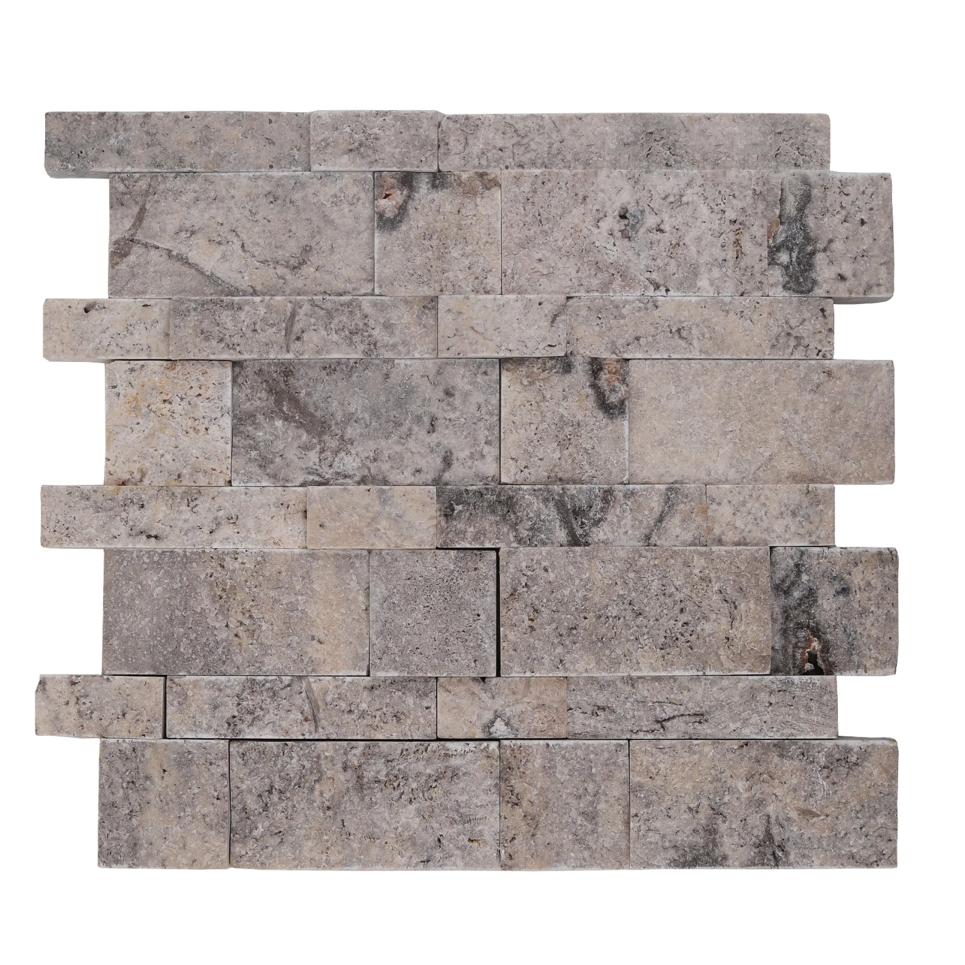 MOZAIC DIN TRAVERTIN SILVER MINIPANEL este realizat din travertin natural în tonuri de gri-argintiu, crem și bej, cu o textură puternic reliefată.