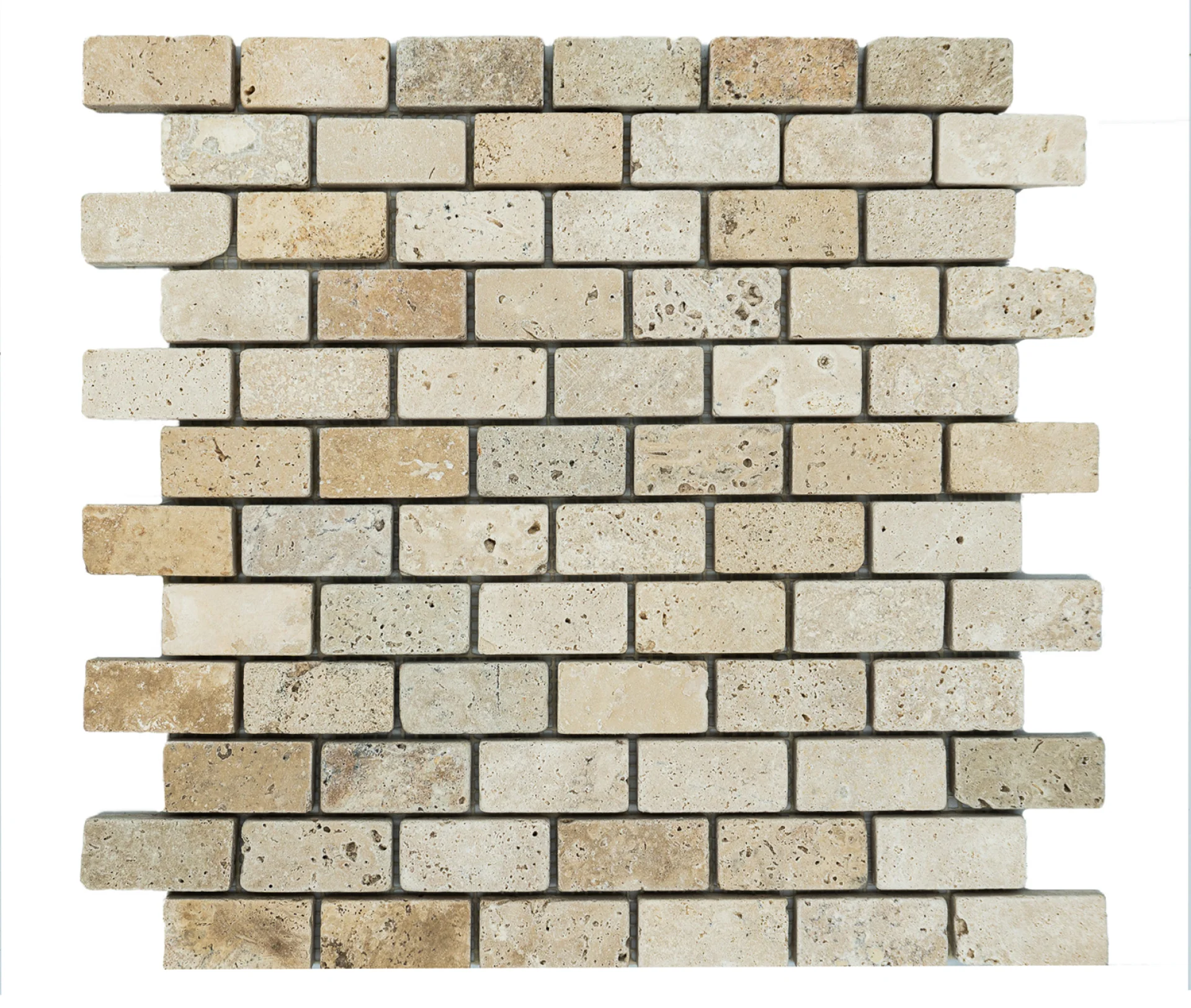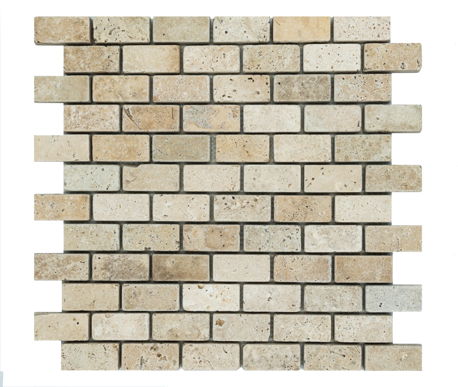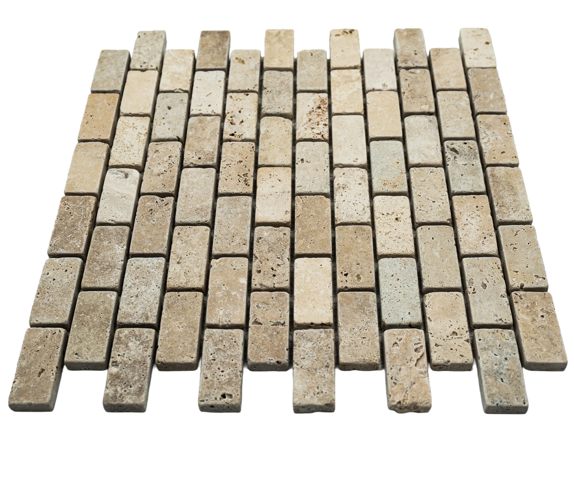MOZAIC DIN TRAVERTIN LIGHT PE PLASA, TUMBLED, NECHITUIT, FORMAT DIN BUCATI DE DIMENSIUNEA 2.3X4.8CM. GROSIME 1 CM.