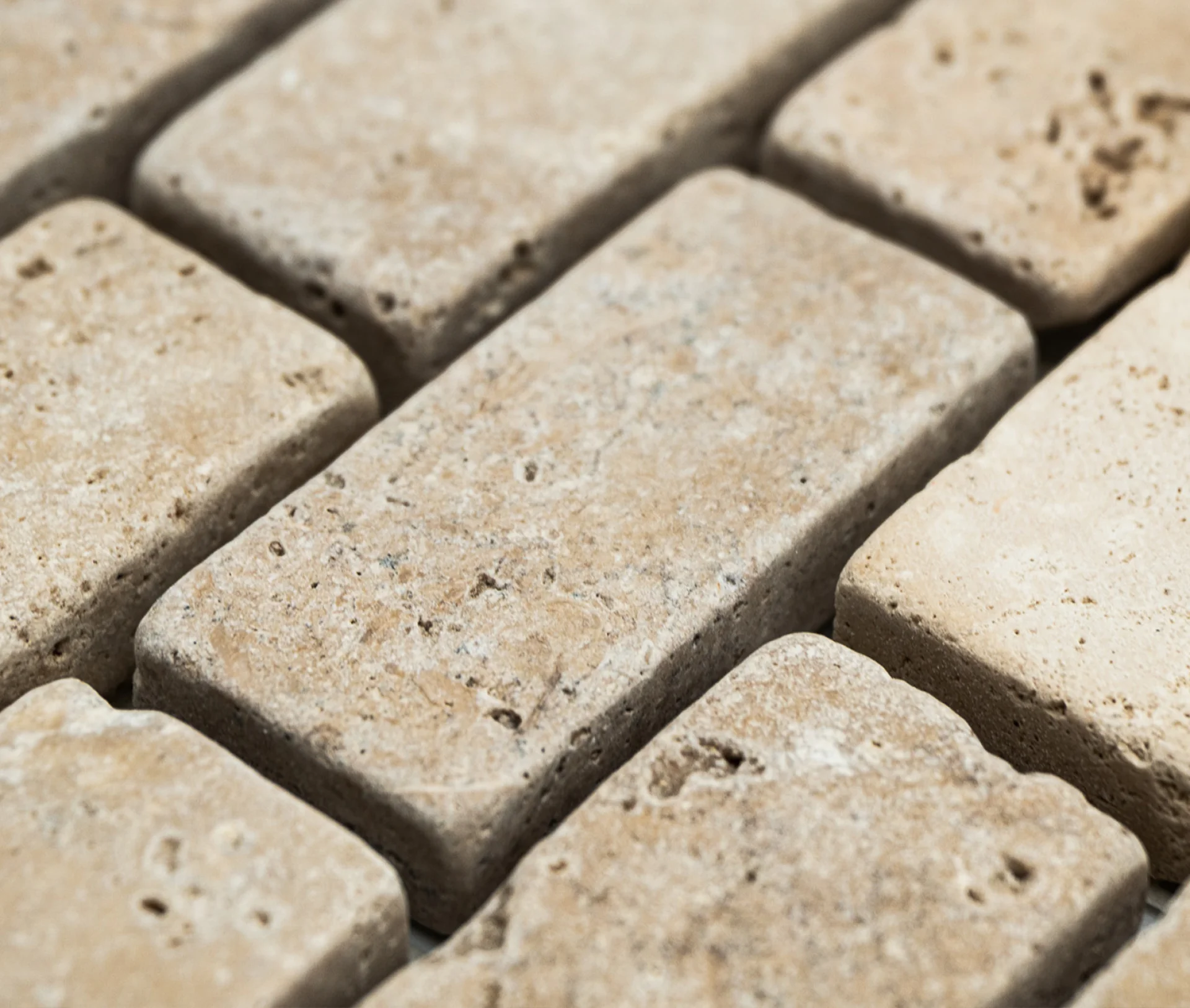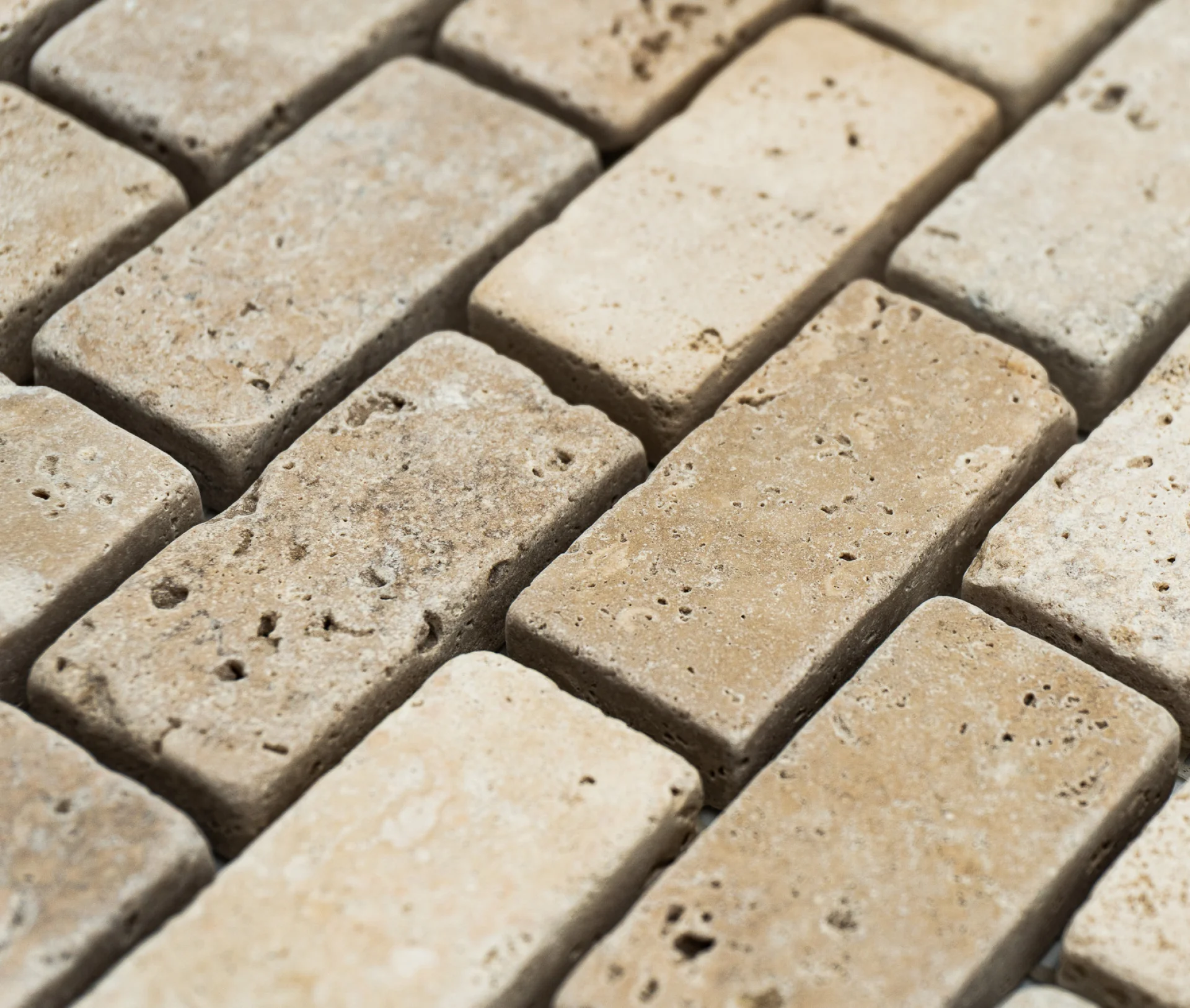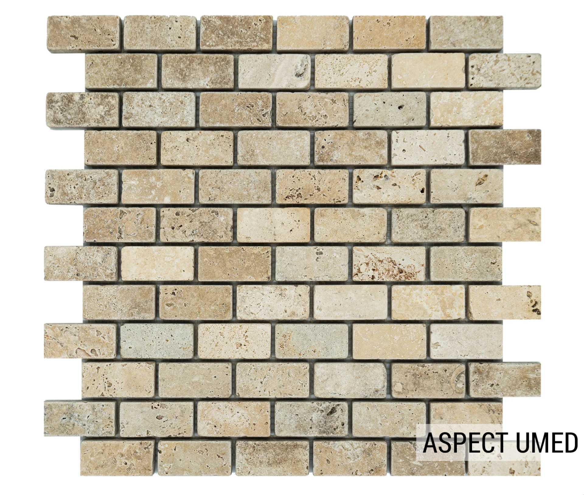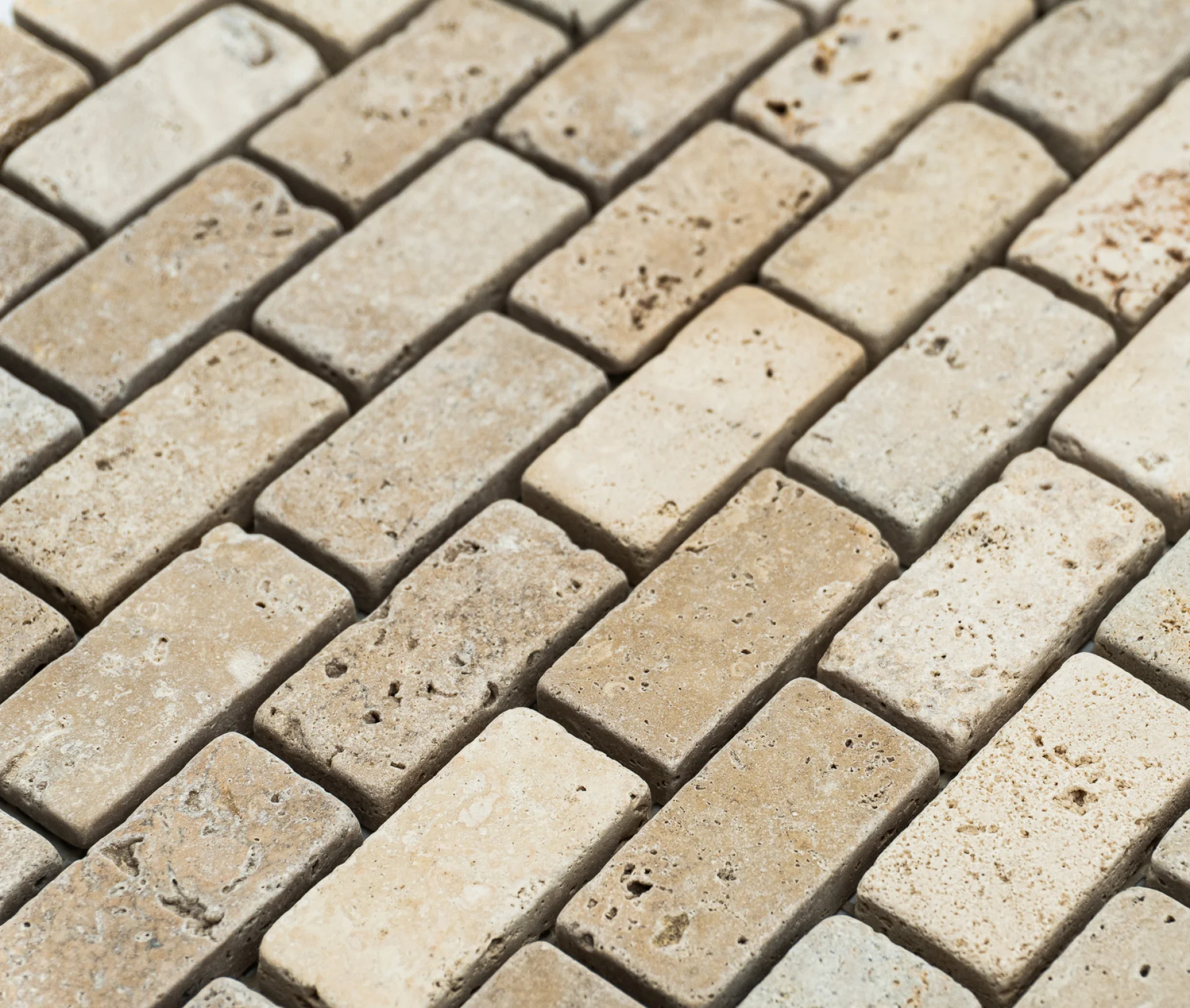 MOZAIC DIN TRAVERTIN LIGHT PE PLASA, TUMBLED, NECHITUIT, FORMAT DIN BUCATI DE DIMENSIUNEA 2.3X4.8CM. GROSIME 1 CM.