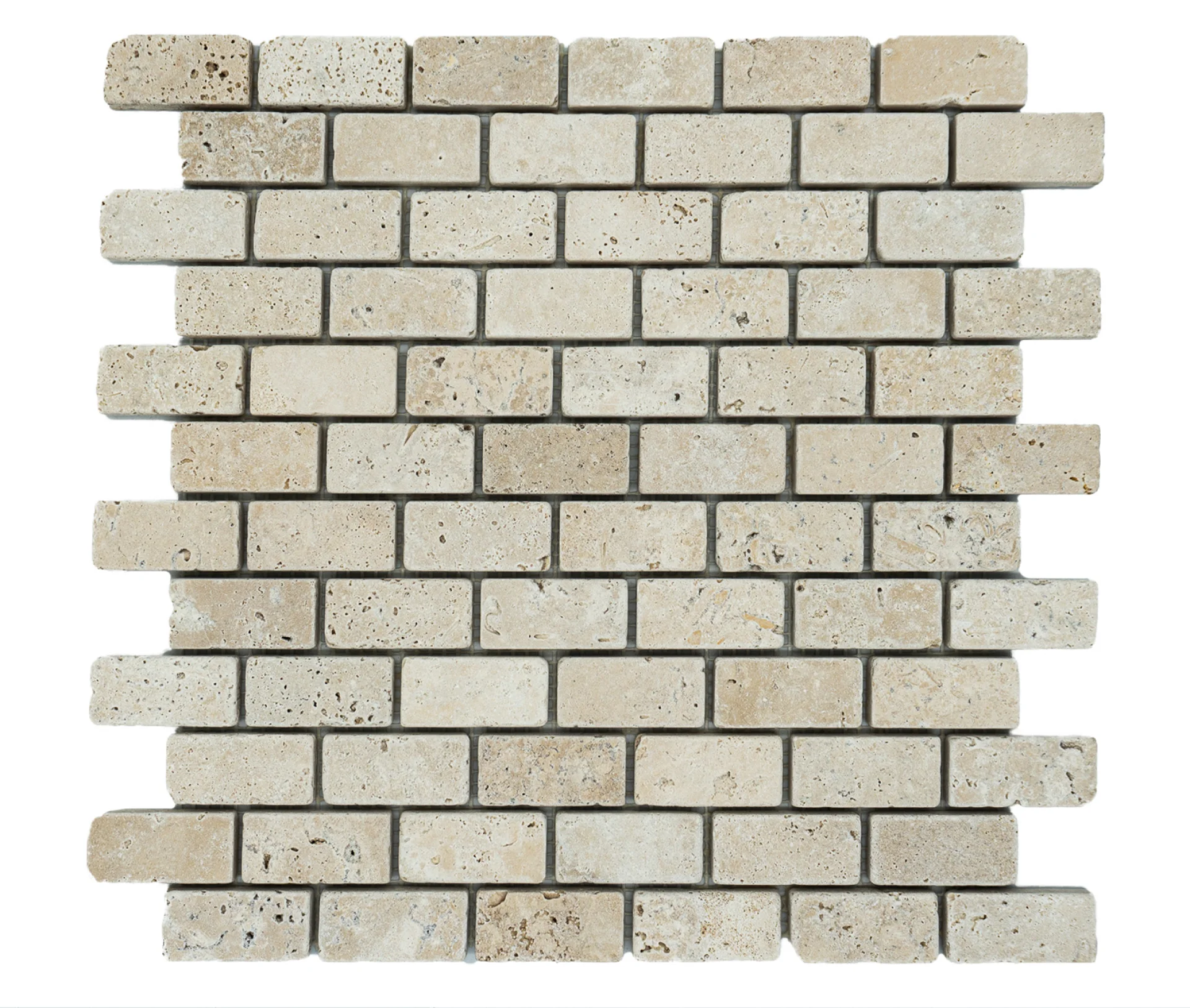 MOZAIC DIN TRAVERTIN LIGHT - 30.5x30.5x1 cm, bej, finisaj tumbled, format din placi de 2.3x4.8 cm, montat pe plasă, ideal pentru decoruri naturale, interior și exterior.