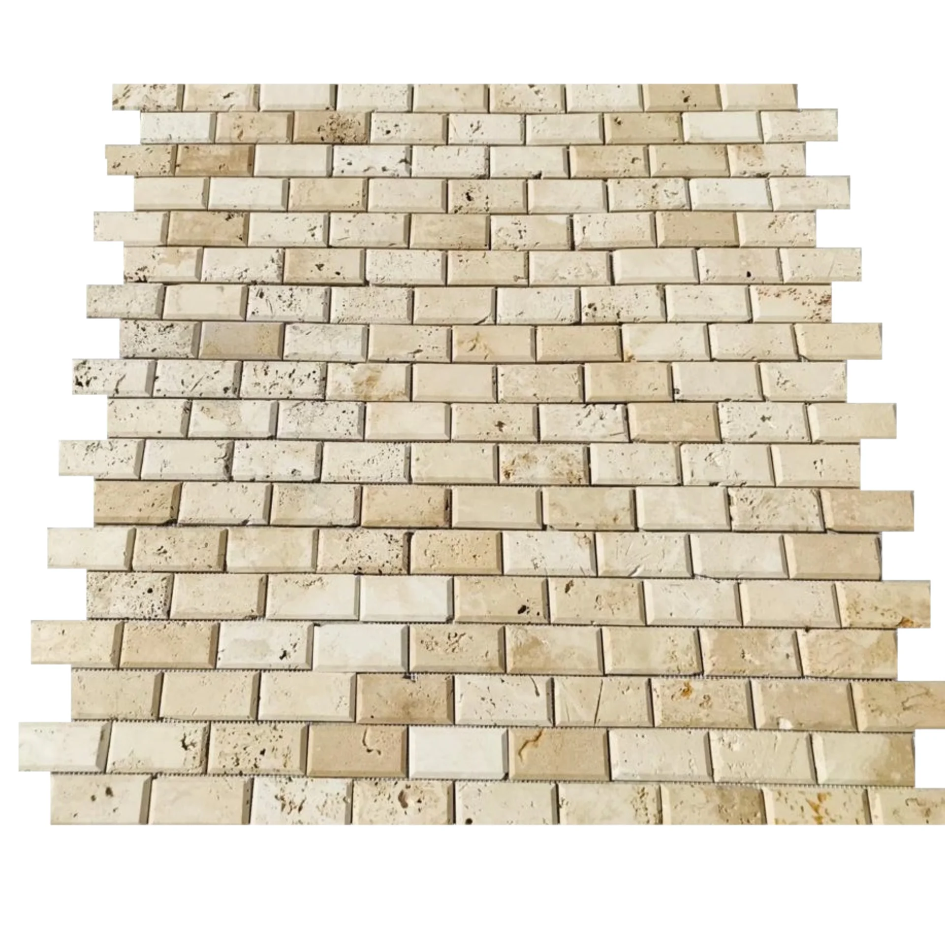 MOZAIC DIN TRAVERTIN LIGHT PE PLASA, BIZOTAT, MAT, NECHITUIT, FORMAT DIN BUCATI DE DIMENSIUNEA 4.9X9.9CM. GROSIME 1 CM.