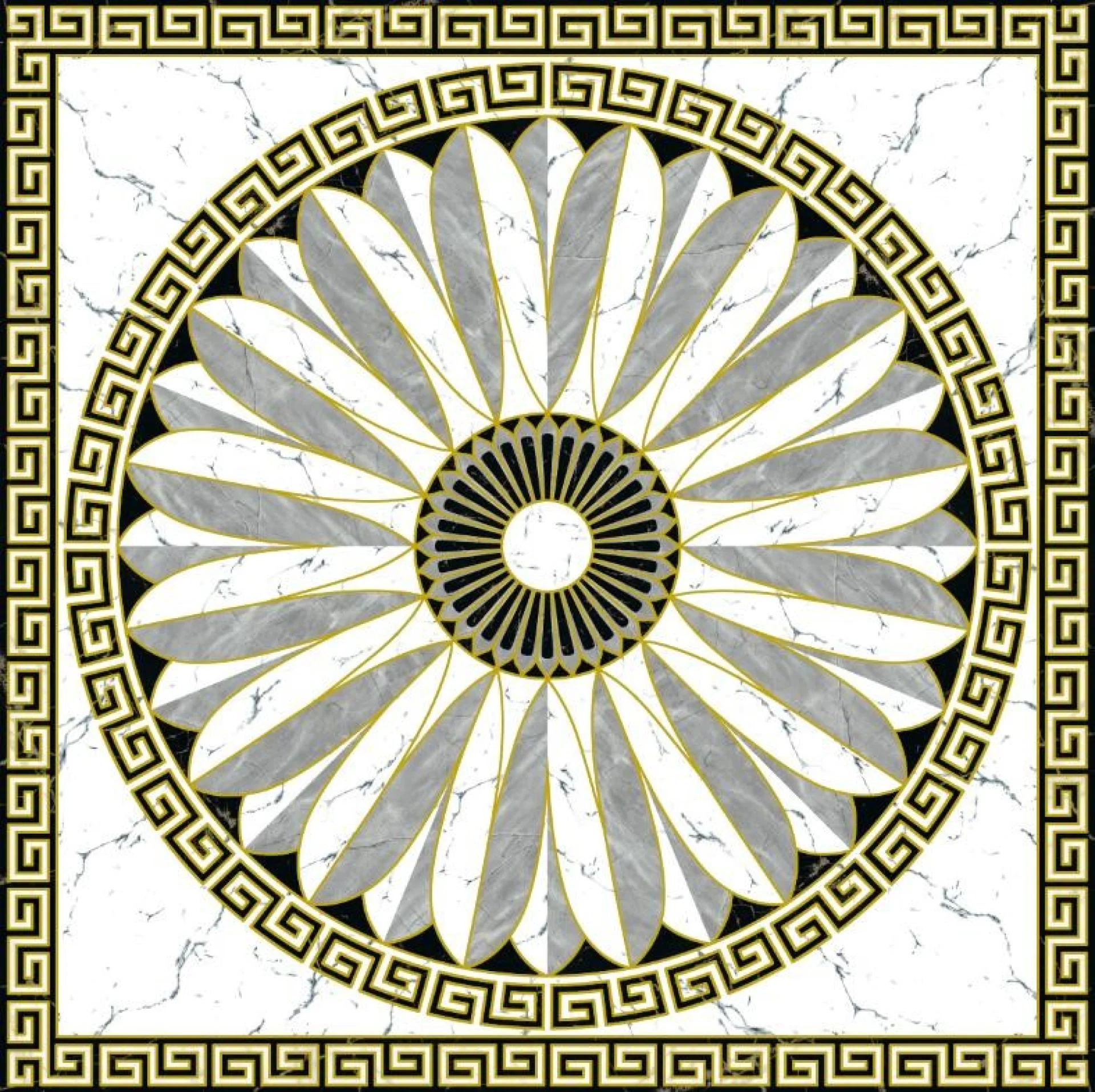 COVOR CERAMIC FC-66PHP14-2105 (4 PLACI) - 120X120 cm, model floral radial cu petale în nuanțe de gri și alb, accentuat cu detalii aurii și bordură neoclasică, format din 4 plăci portelanate glazurate.