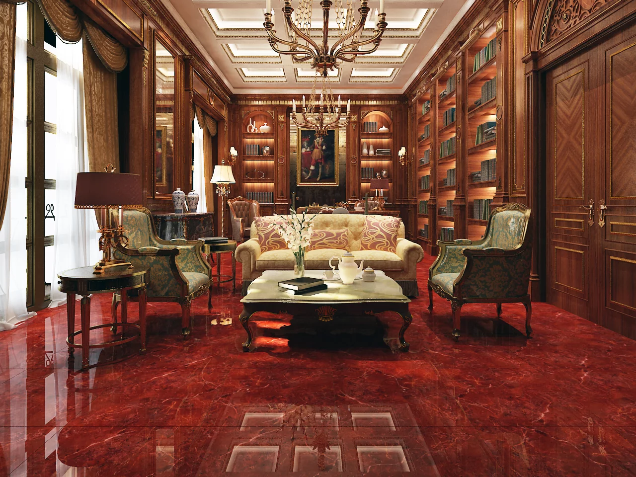 Gresia FC-8474H se remarcă prin culoarea sa de roșu intens, cu vene naturale mai închise și accente subtile ce imită marmura, aducând un aer dramatic și luxos în orice interior.
