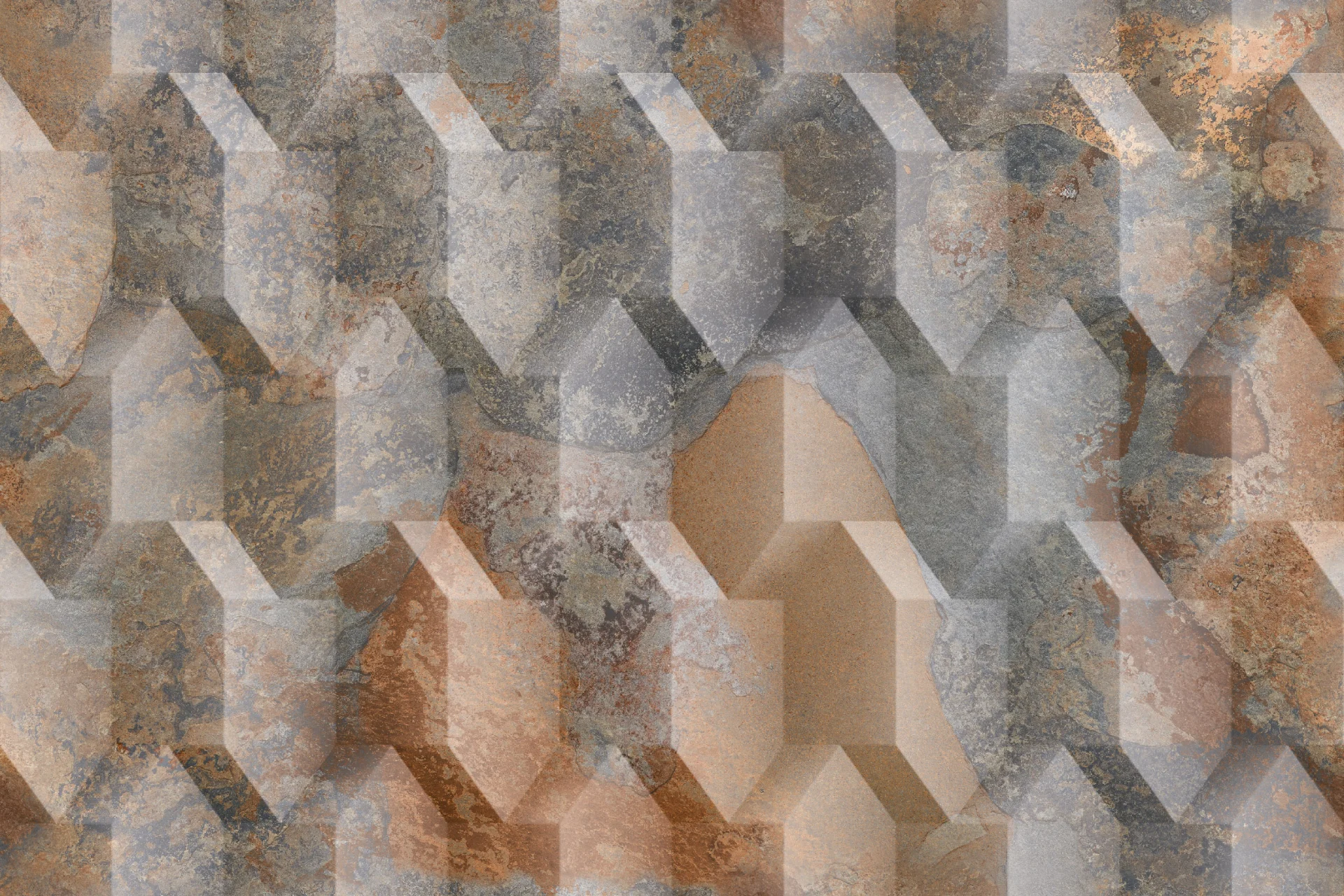 FAIANTA GOLD RUST 556 HL - 30X45 cm, ceramica glazurată, mată, rectificată, pentru interior, design geometric 3D în nuanțe de cupru, gri și bej, ideal pentru accente contemporane.