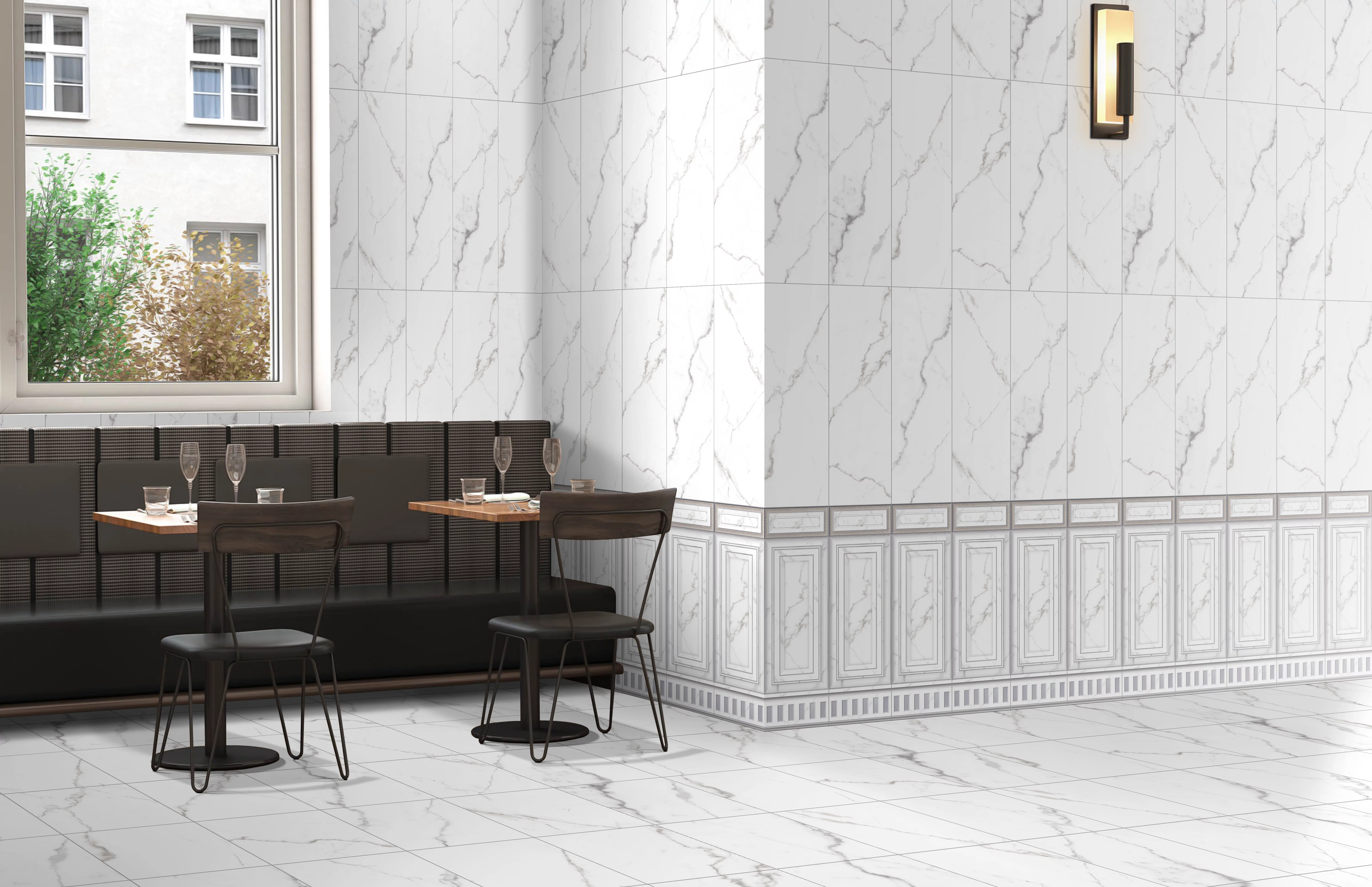 Gresia HARPER FLOOR aduce în decorul interior rafinamentul marmurei albe cu nervuri fine gri.
