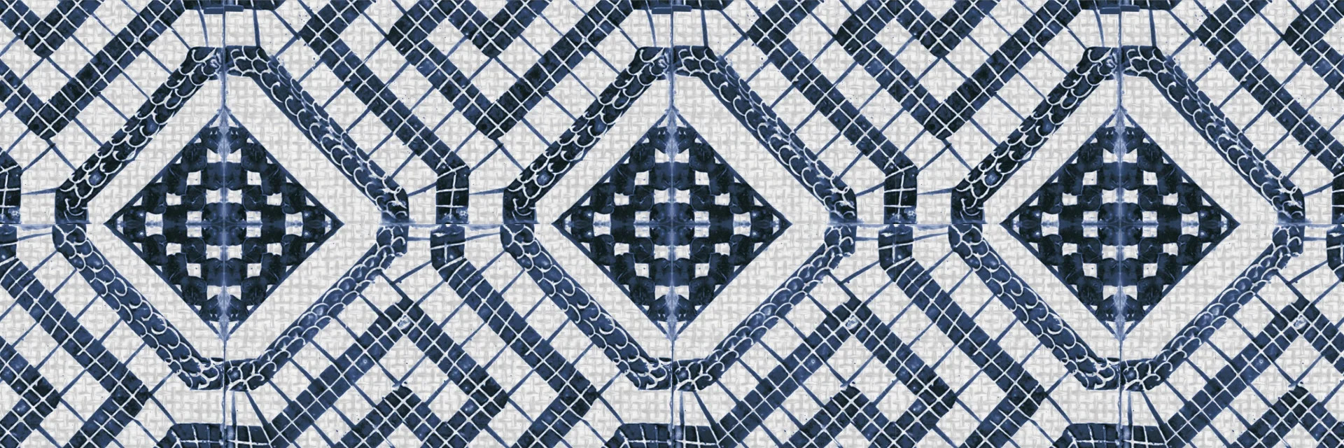 FAIANTA ETHAN BLUE DECOR - 25X75 cm, ceramica glazurata, rectificata, mată, finisaj in relief, imprimeu alb-albastru geometric, gen mosaic, stil etnic modern.