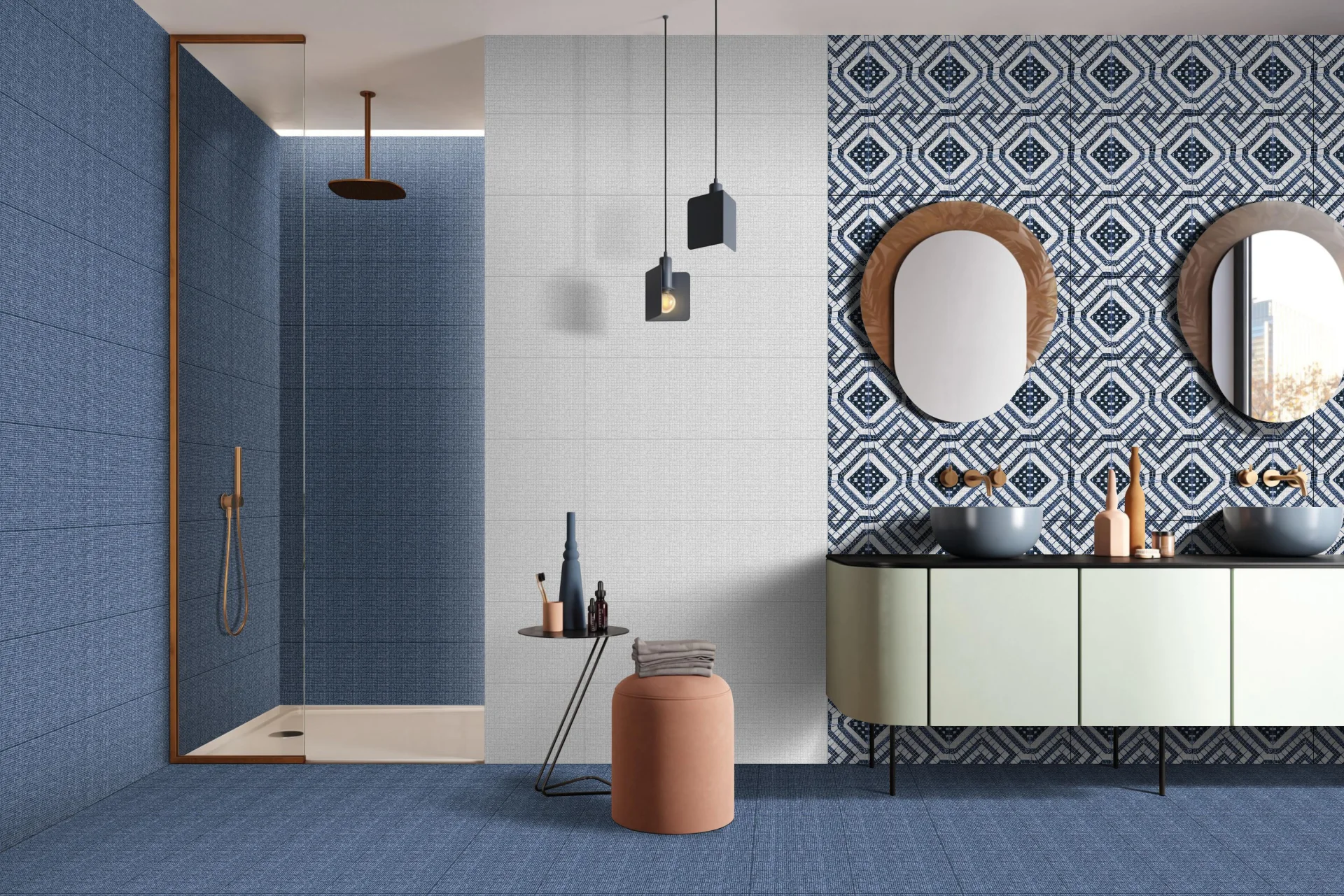 Faianta ETHAN BLUE DECOR adaugă personalitate și rafinament oricărui spațiu interior prin imprimeul său complex și accentele alb-albastru.