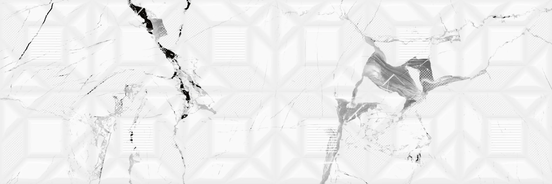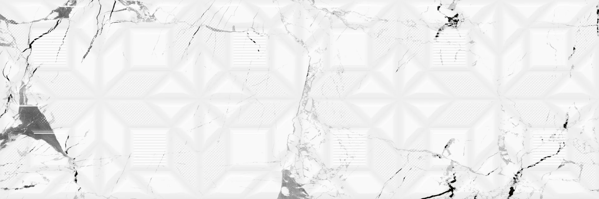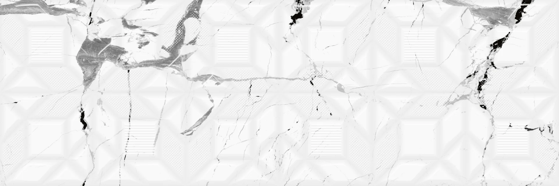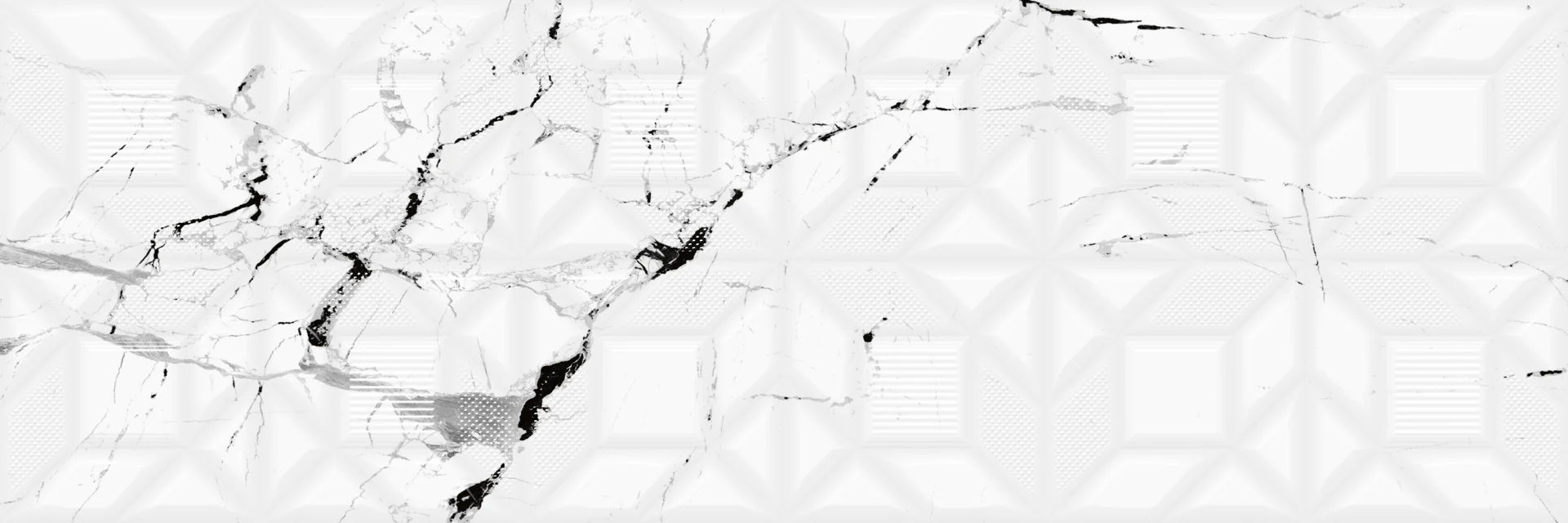 Faianța BLACK INK MARBLE AC-12369 HL1 este piesa statement a colecției Black Ink Marble, integrând un model geometric tridimensional subtil, aplicat pe o bază elegantă de marmură albă cu vinișoare închise.