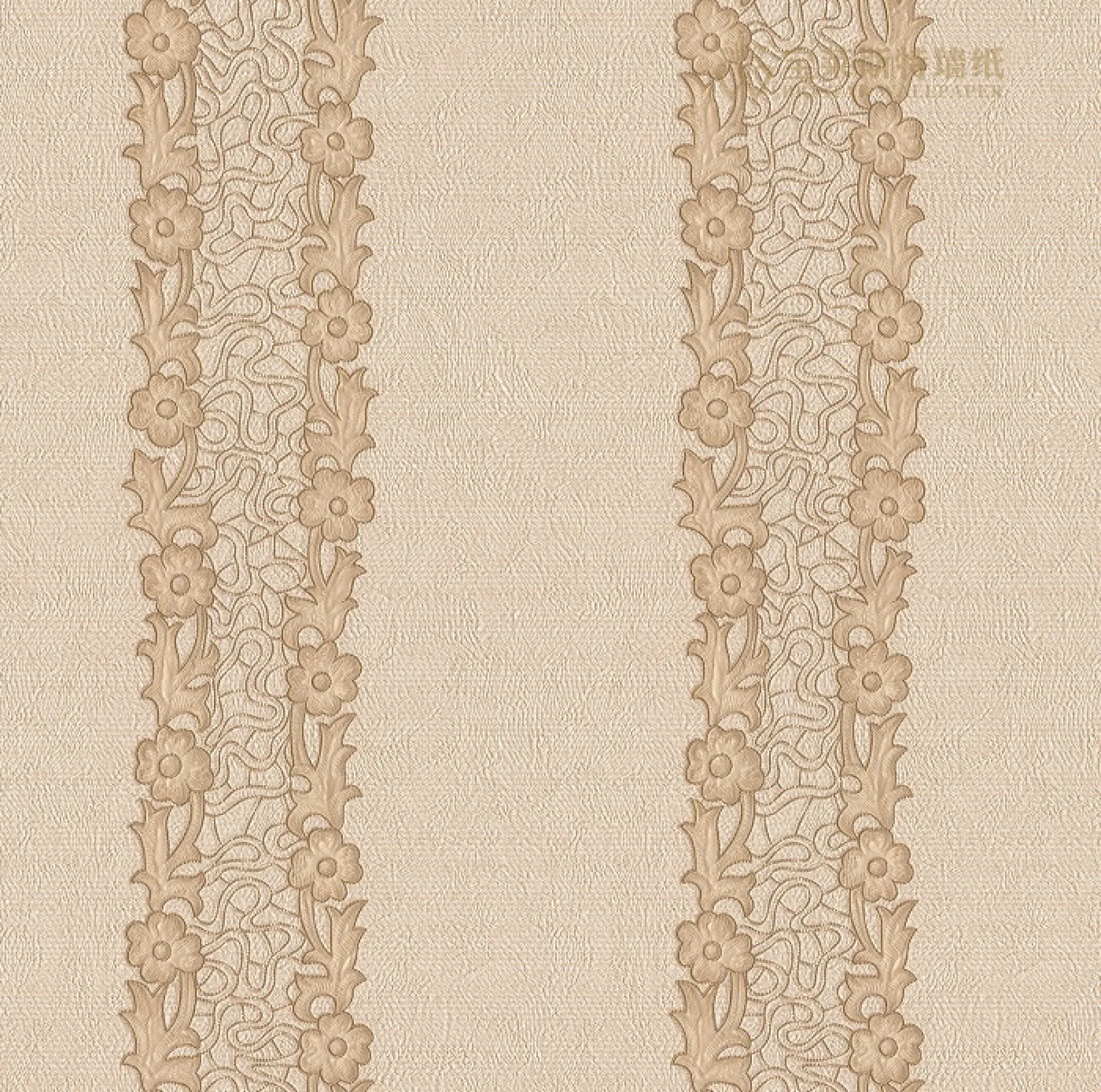 TAPET PVC TALISA 832205 - 53X1000 cm (5.3 mp/rola), în nuanțe calde de bej, cu dungi verticale și motive florale în relief. O alegere elegantă pentru interioare clasice sau romantice, oferind rafinament și textură pereților.