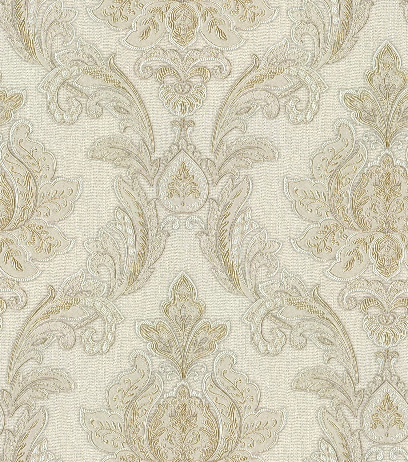 Cu un model damasc bogat, în relief discret, în tonuri calde de crem și bej, acest tapet adaugă profunzime și eleganță pereților. Detaliile ornamentale simetrice amintesc de stilul baroc reinterpretat modern, oferind o atmosferă luxoasă, dar echilibrată.