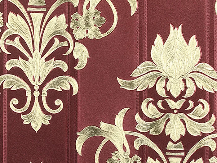 Tapetul GOLDEN 13841 se remarcă prin contrastul elegant dintre fundalul burgundy intens și modelul floral baroc stilizat în auriu cald, cu accente ușor perlate.