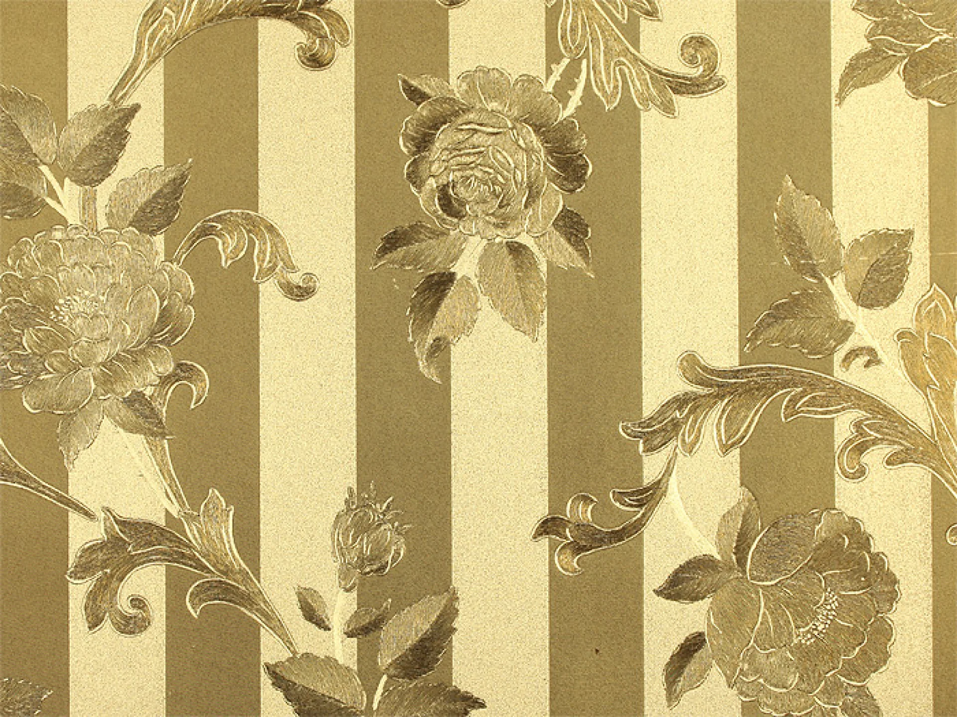 TAPET PVC GOLDEN 66210 - 53X1000 cm, cu aspect satinat si metalizat, model floral embosat pe fundal cu dungi verticale aurii, în stil clasic-elegant.
