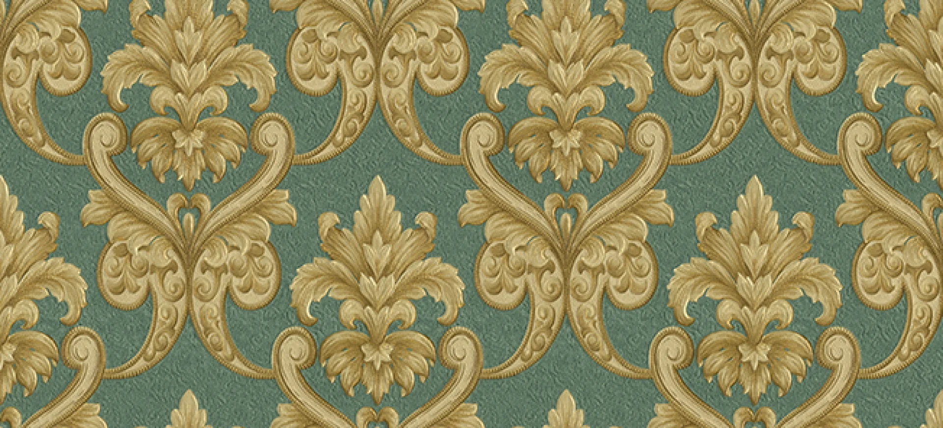 Tapet VANESSA GK 863801 – 70x1000 cm (7 m²/ rolă), PVC, lavabil, model baroc elegant cu ornament auriu pe fundal verde smarald.