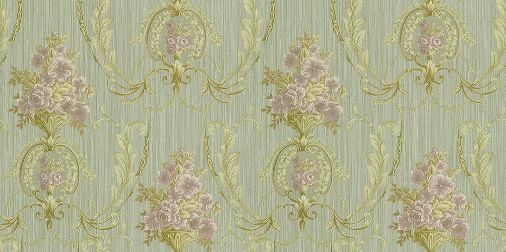 Tapetul GRIES GK 87540 aduce farmecul stilului clasic într-o interpretare romantică, cu un model floral baroc încadrat în medalioane aurii și nuanțe pastelate de roz, crem și vernil.