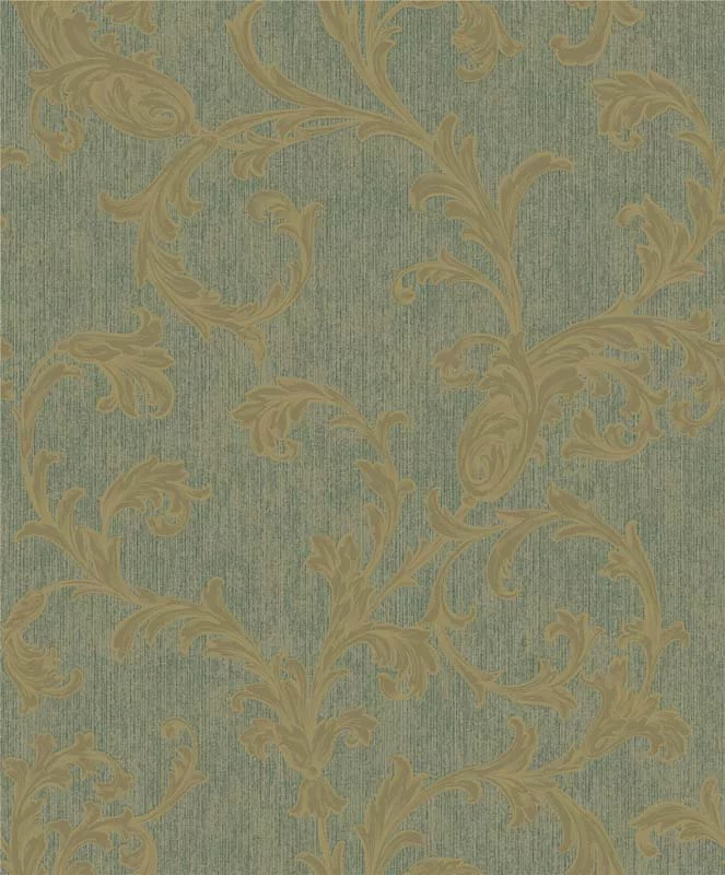 Tapetul BLUE JAZZ GK NVP 324708 îmbină un fundal verde texturat cu un model baroc aurit, oferind o compoziție elegantă și vibrantă. Frunzele și volutele ornamentale aurii sunt evidențiate în relief și adaugă dinamism și profunzime vizuală, pe un fundal în tonuri de verde natural, ușor periat.