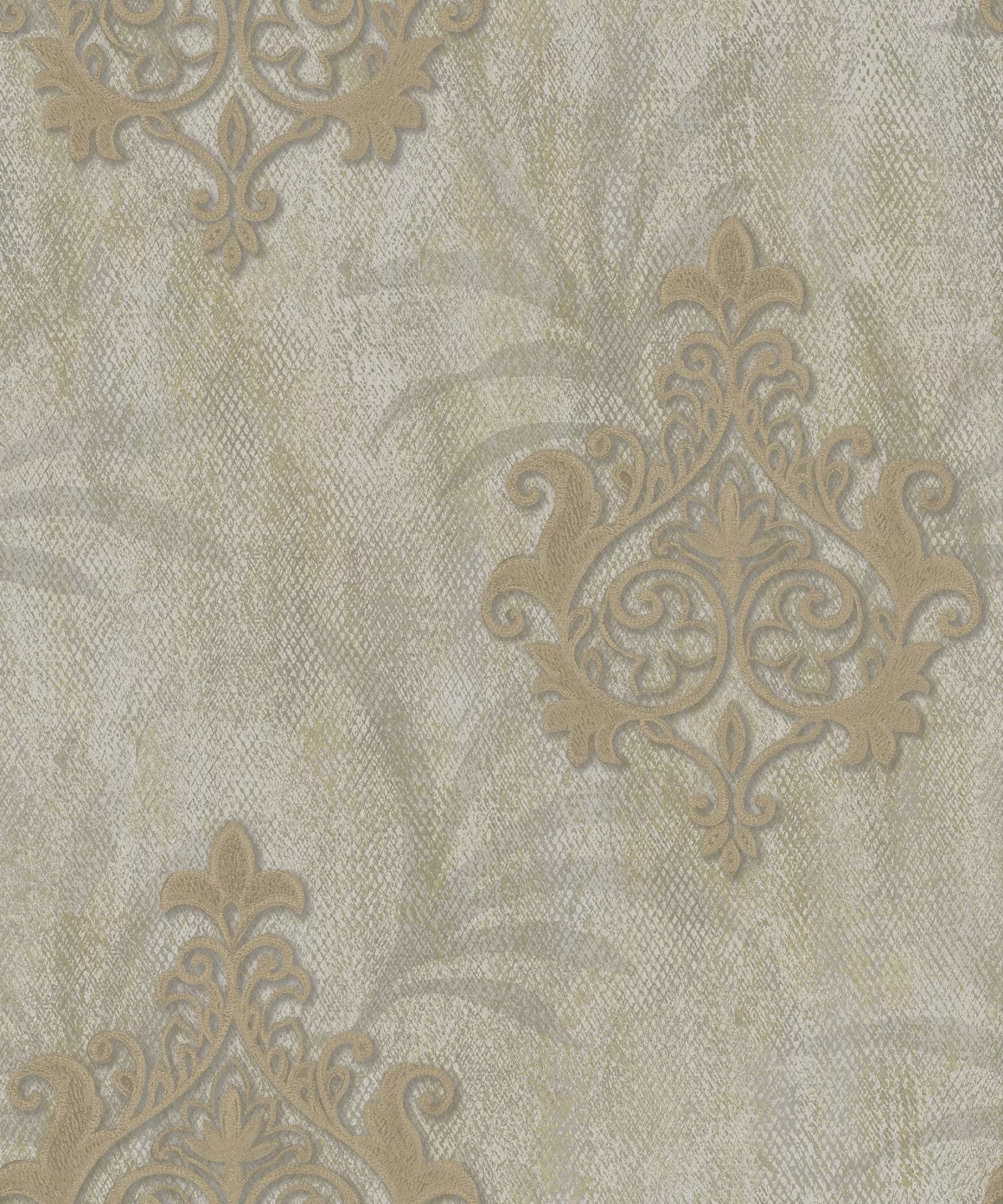 Modelul ornamental simetric, inspirat din stilul baroc, este amplasat pe un fundal subtil texturat în nuanțe calde de crem-bej și auriu patinat, cu efect ușor perlat.
