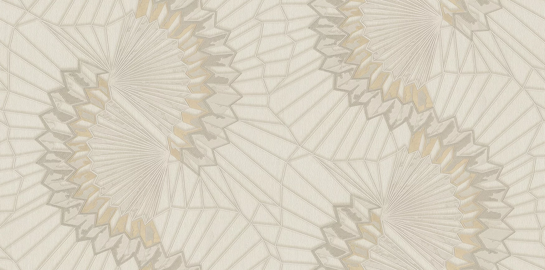 TAPET PVC ROYAL 93035 - 106X1000 cm (10.6 mp/rolă), cu model geometric tridimensional în nuanțe rafinate de crem, gri și auriu deschis. Ideal pentru interioare elegante, moderne sau contemporane.