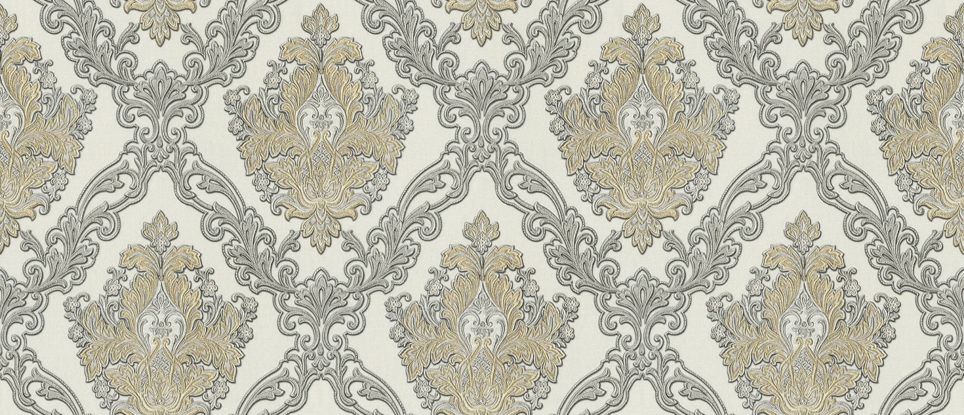 TAPET PVC ROYAL 95038 aduce un aer regal și impunător în orice spațiu, datorită modelului damasc complex, în relief pronunțat, cu detalii aurii și contururi argintii elegante.