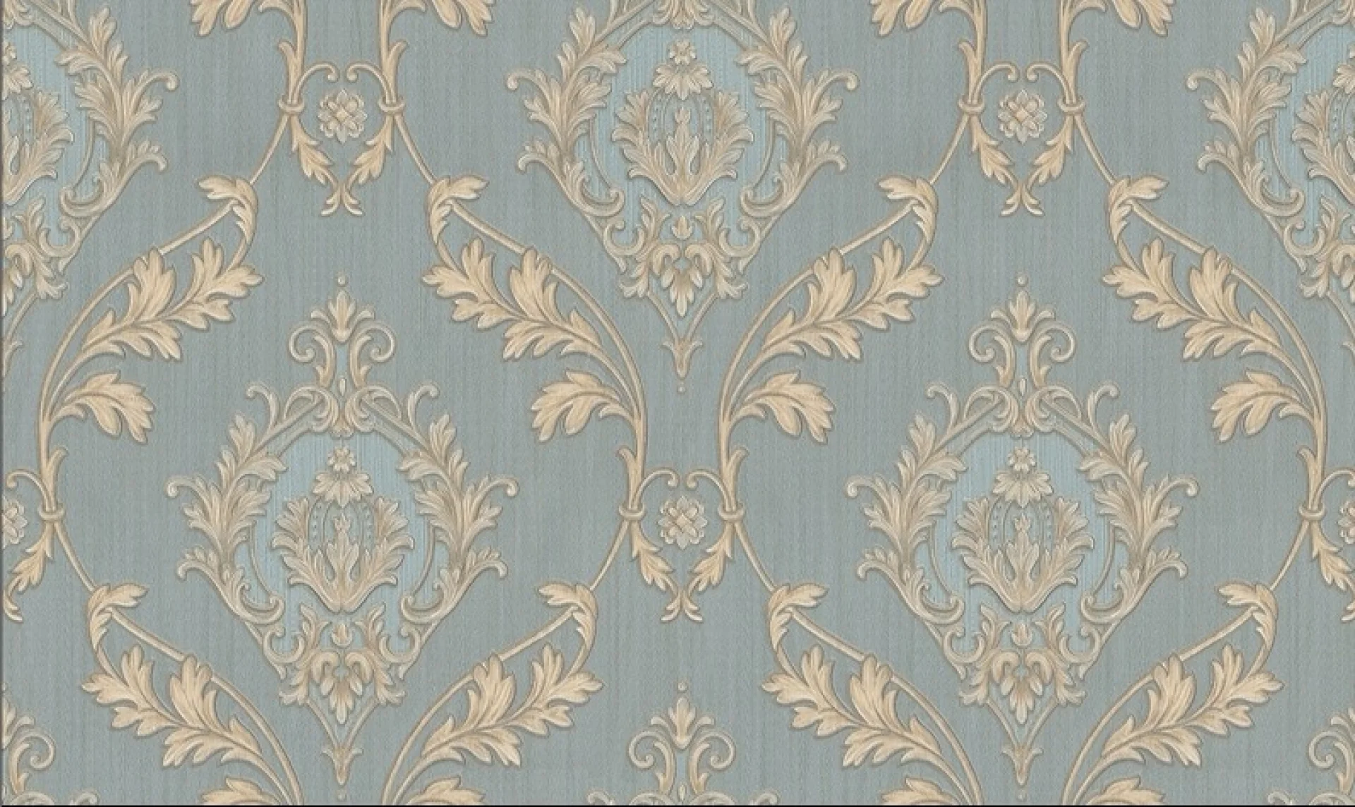 TAPET PVC ROYAL 96002 - 106X1000 cm (10.6mp/rola), cu model baroc repetitiv la 64 cm, în nuanțe elegante de albastru-gri și bej auriu. Ideal pentru interioare clasice și rafinate.