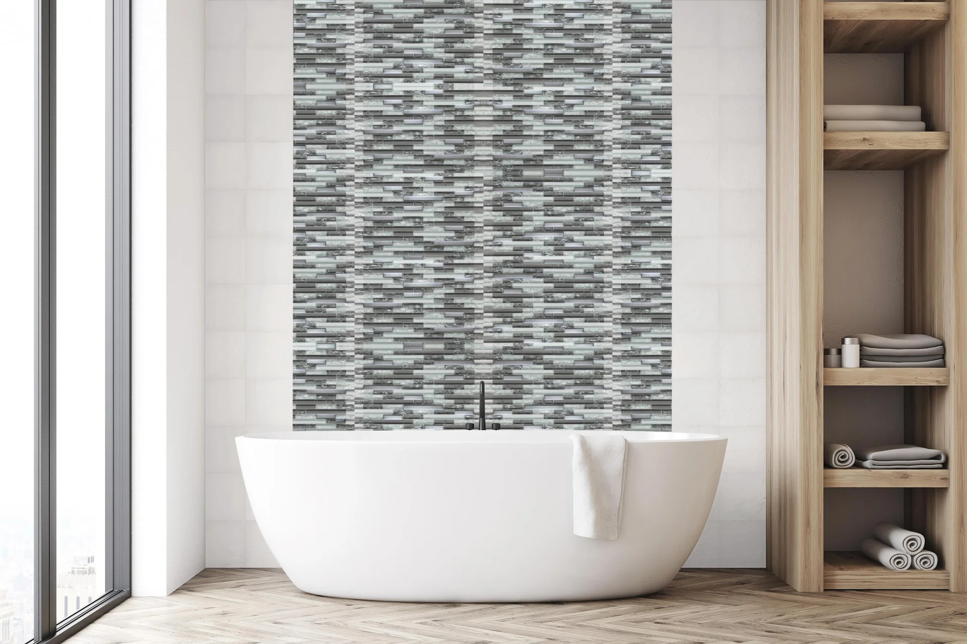 MOZAIC DIN STICLA PE PLASA WA360 - 30X30 cm, montat pe plasă, în nuanțe de gri, alb și argintiu, cu finisaj lucios și metalic, ideal pentru decoruri interioare moderne și elegante.