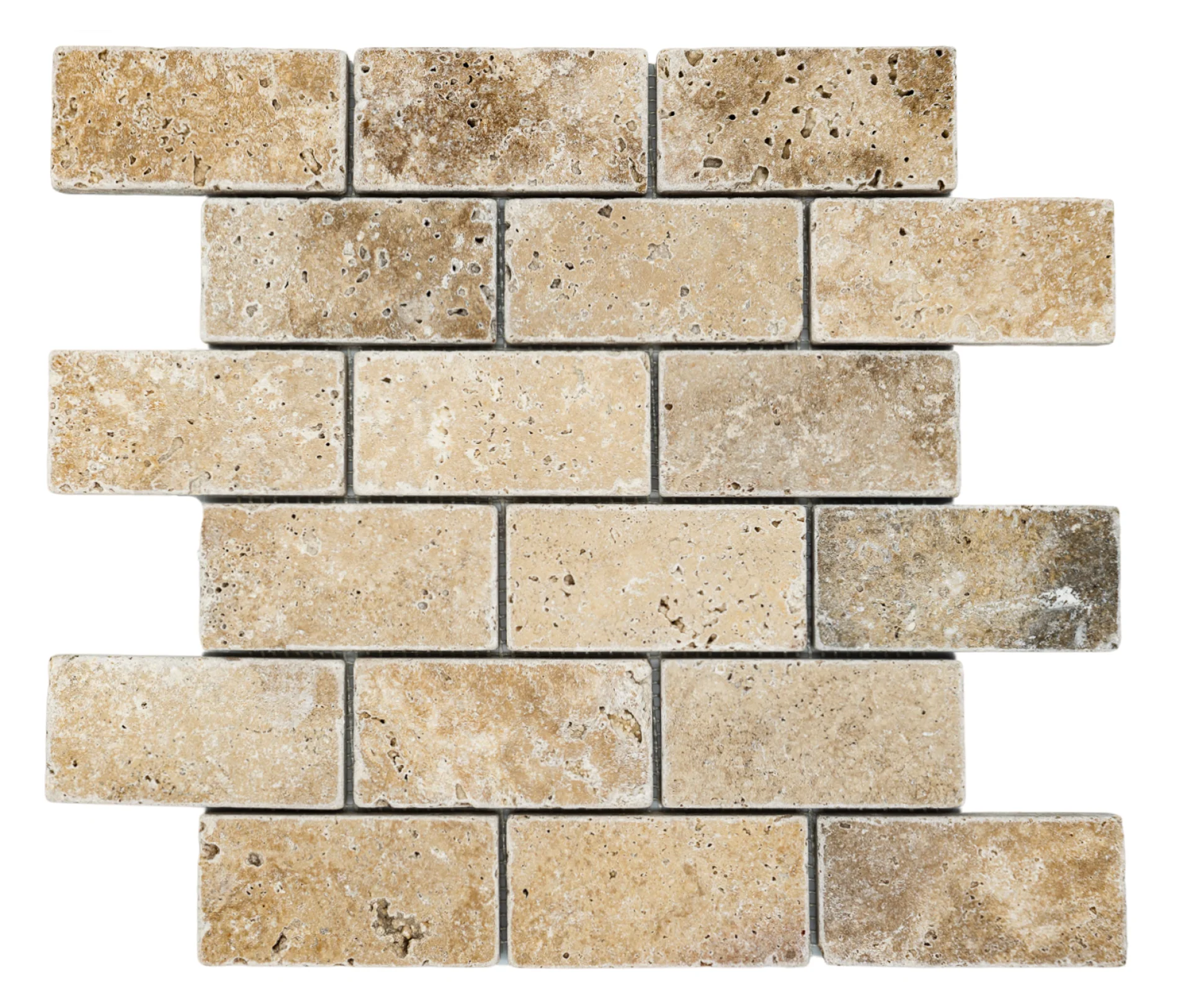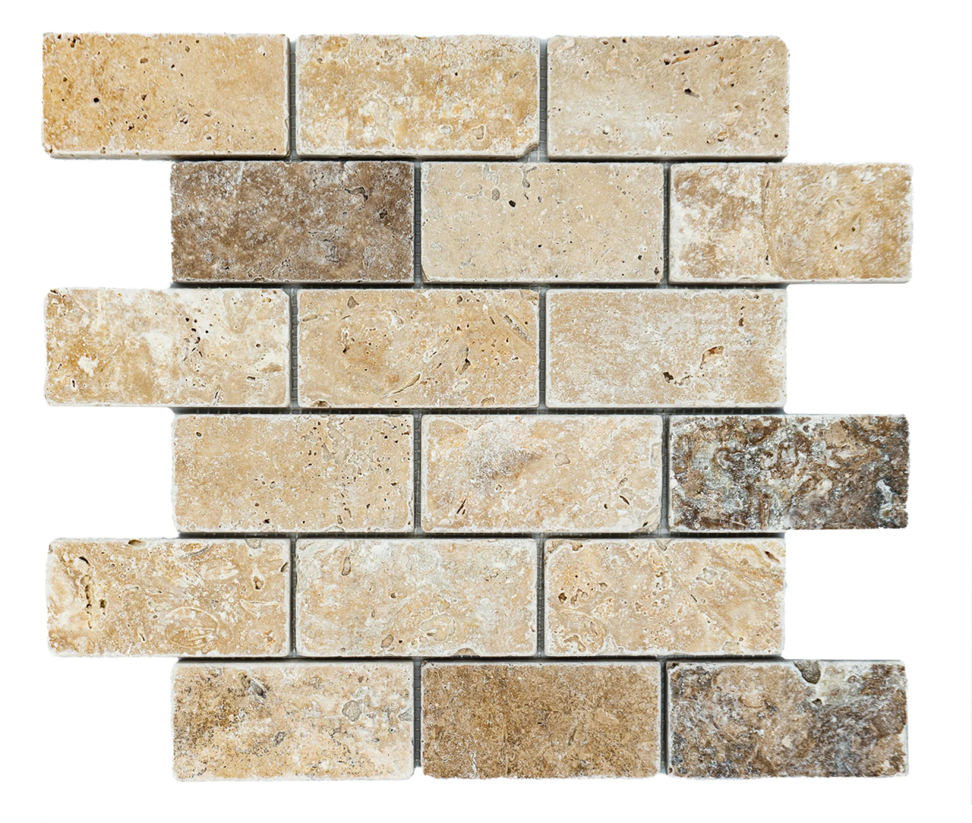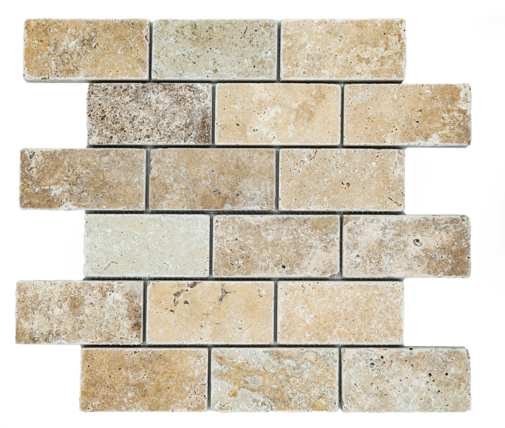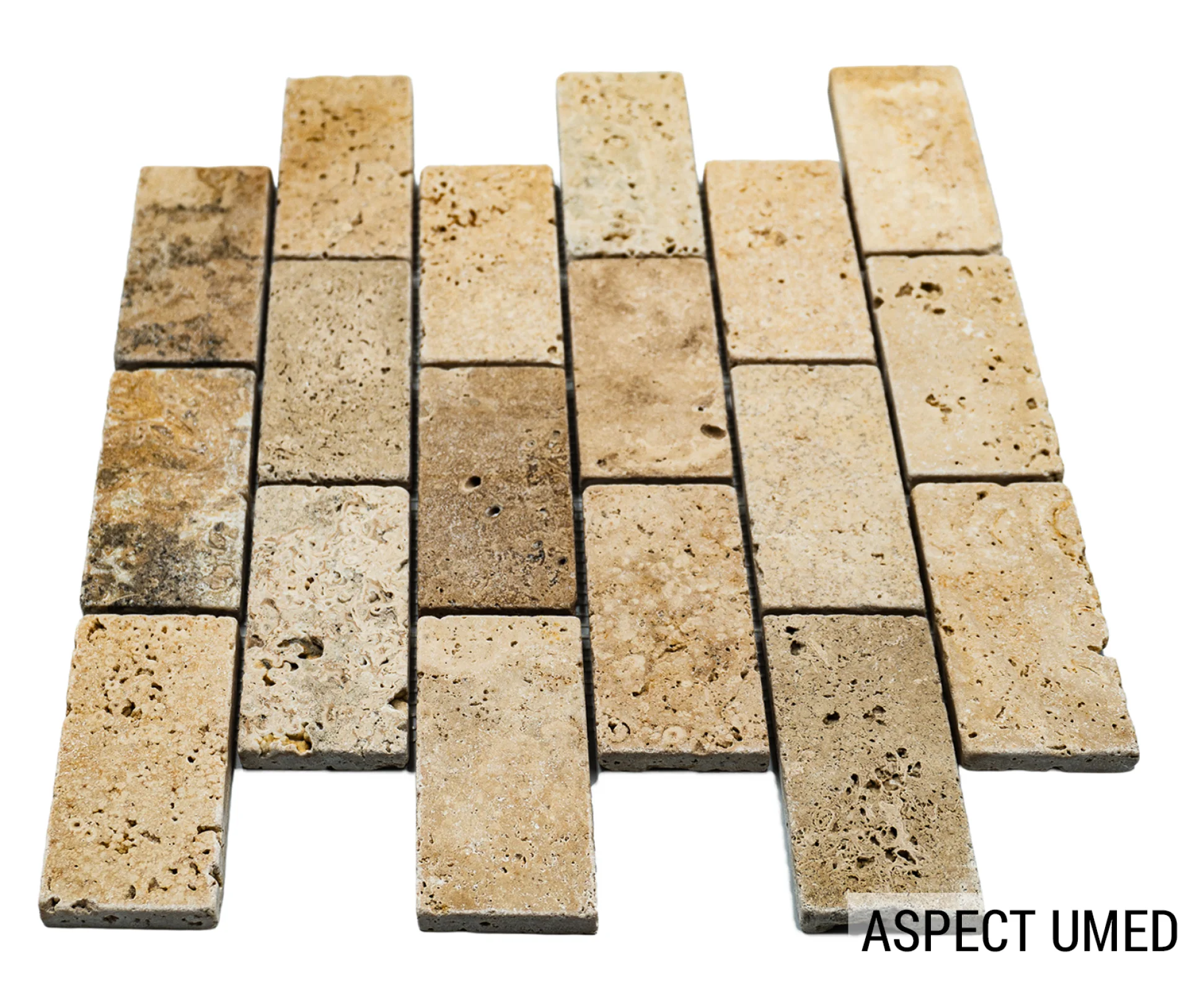 MOZAIC PE PLASA DIN TRAVERTIN ANTICHIZAT, DIMENSIUNE BUCATI DE 4.8X10 CM, GROSIME 1 CM