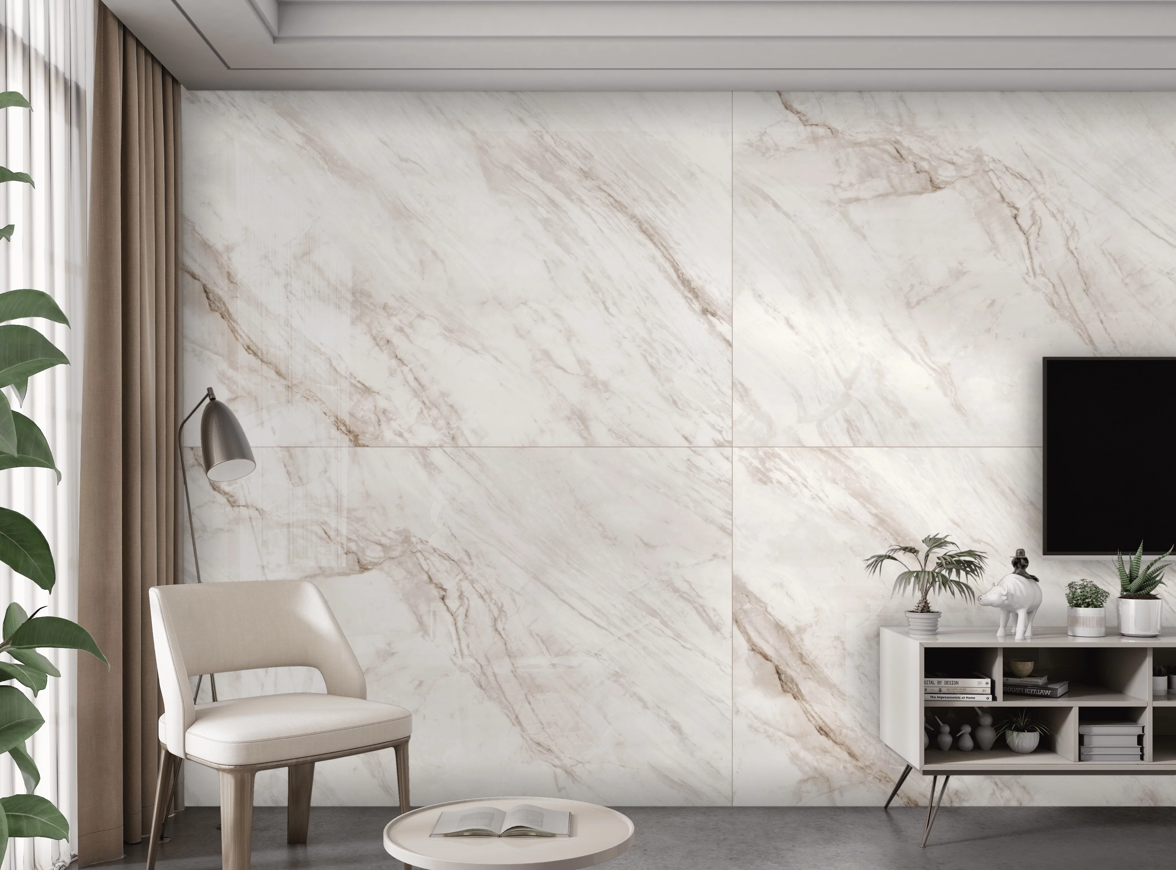 Plăcile de dimensiuni mari impresionează prin aspectul lor rafinat, inspirat din marmura albă, cu delicate vene gri-bej care adaugă profunzime și naturalețe.