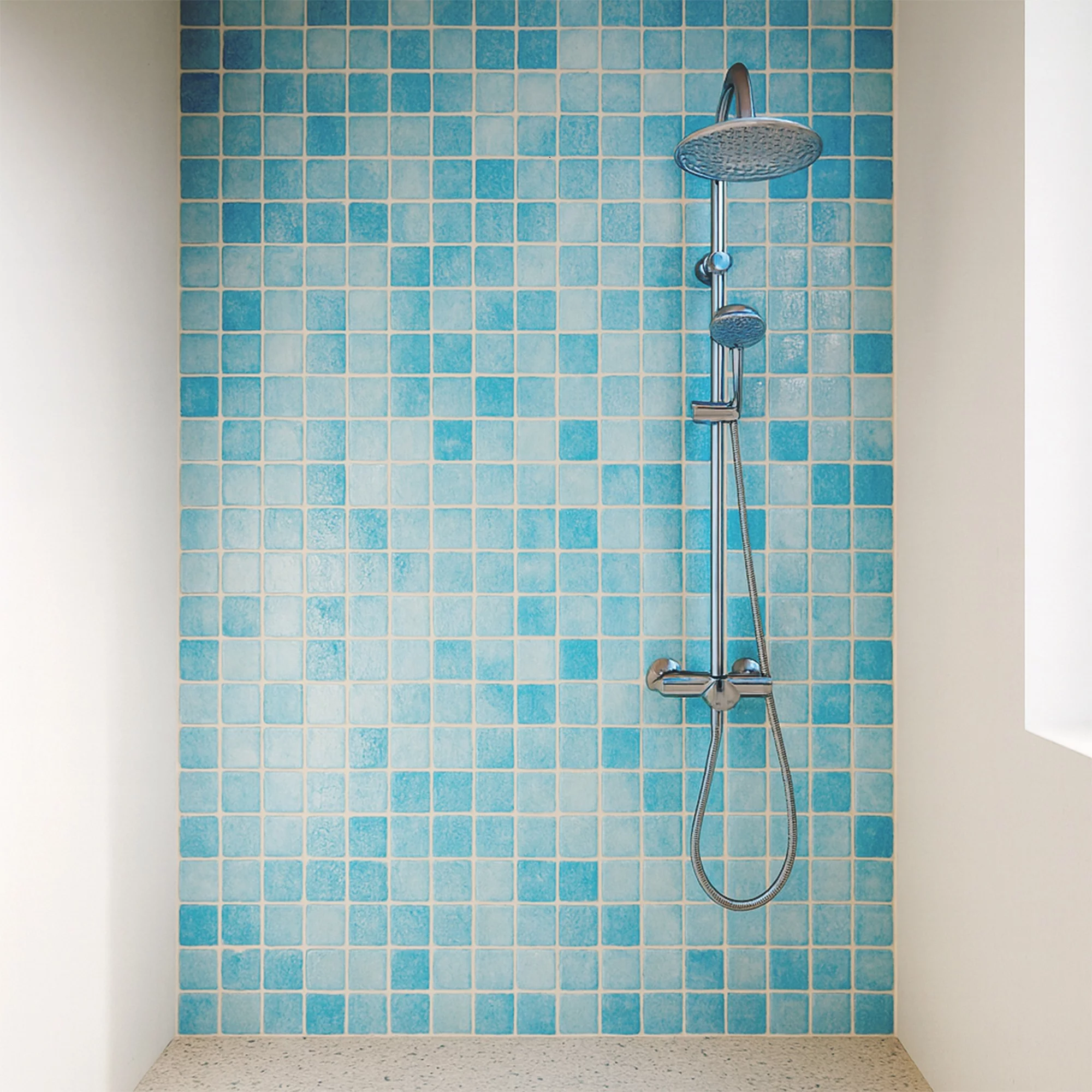 Culoarea bleu deschis creează o atmosferă relaxantă și curată, fiind perfectă pentru piscine, băi sau pereți decorativi.