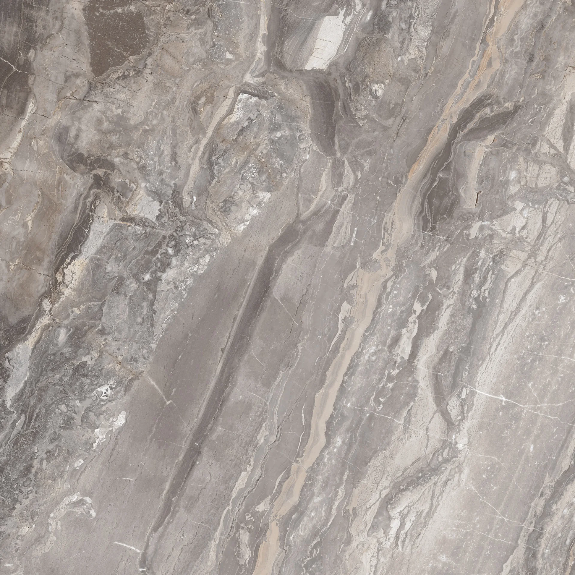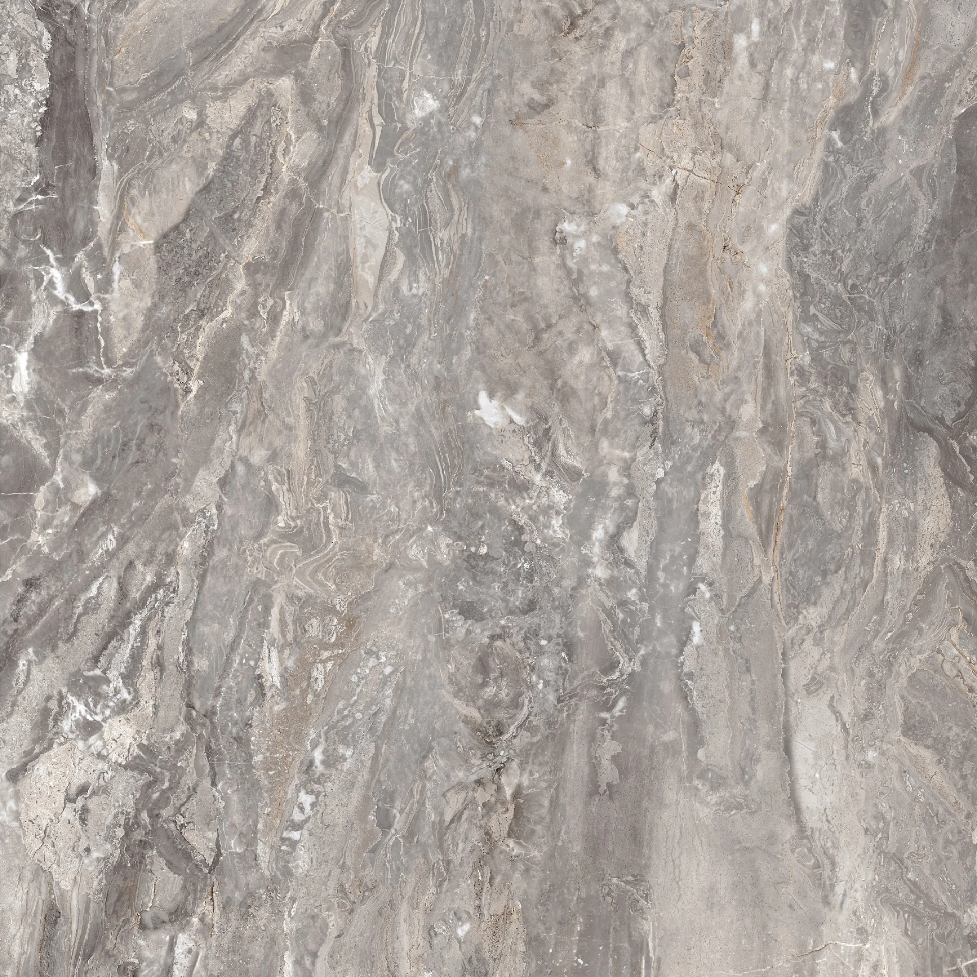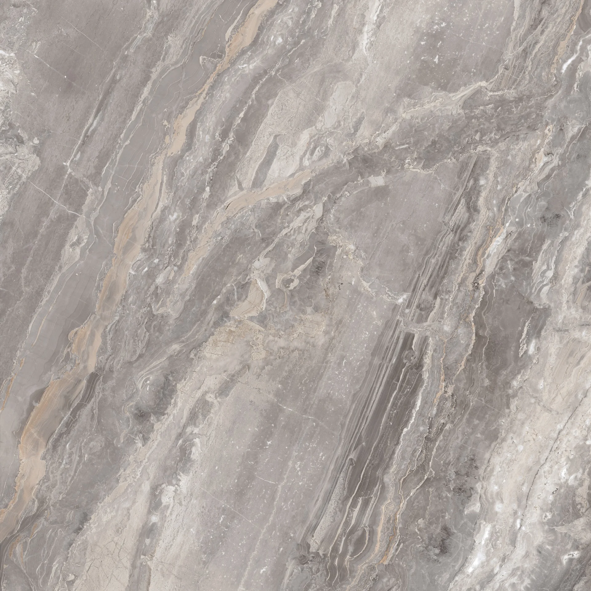 GRESIE OROBICO - 120X120 cm, porțelanată, în nuanțe de gri cu inserții bej și vene elegante, aspect de marmură naturală, finisaj super lucios high glossy, ideală pentru interioare sofisticate.