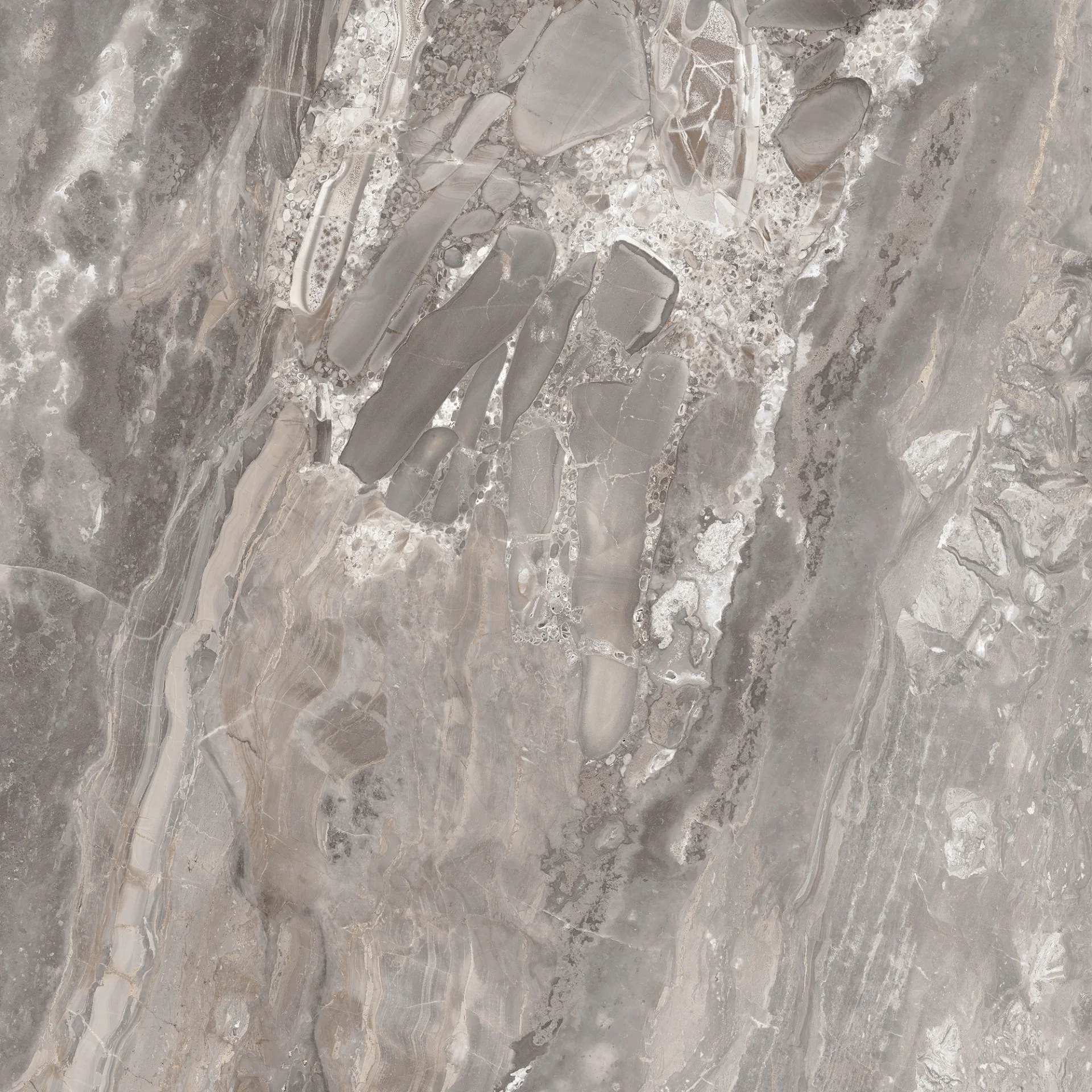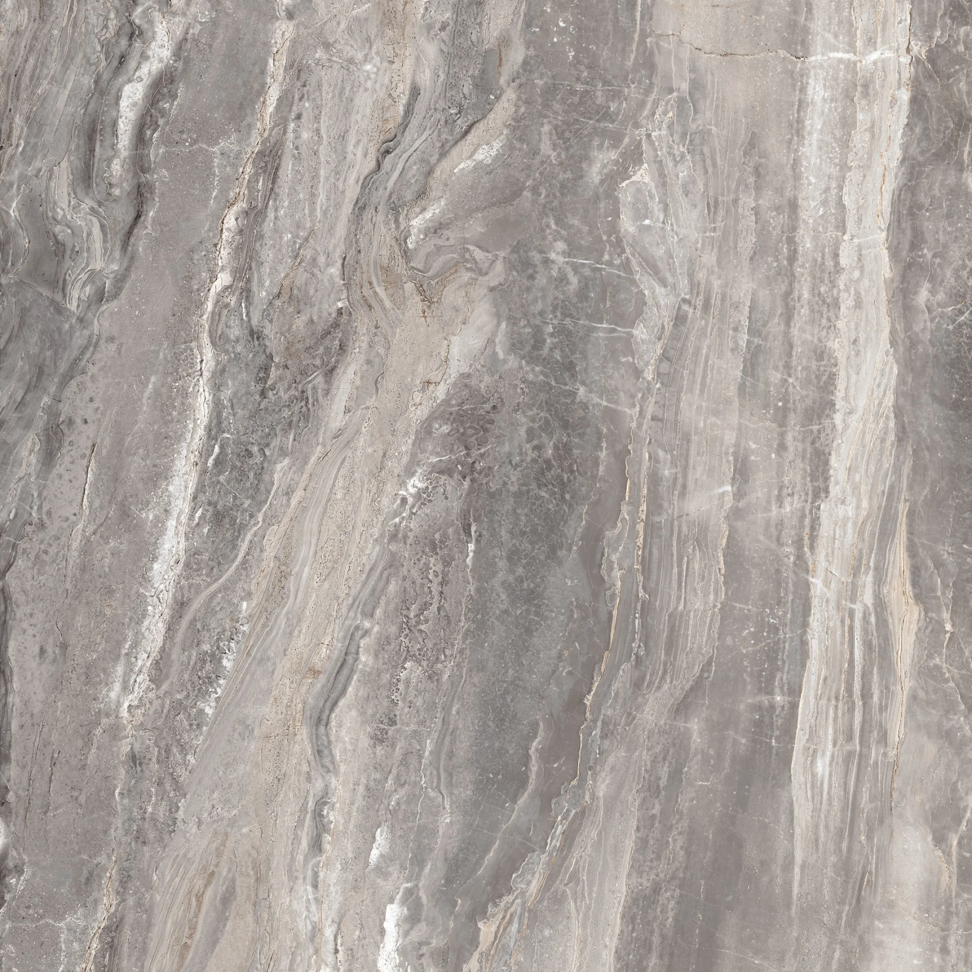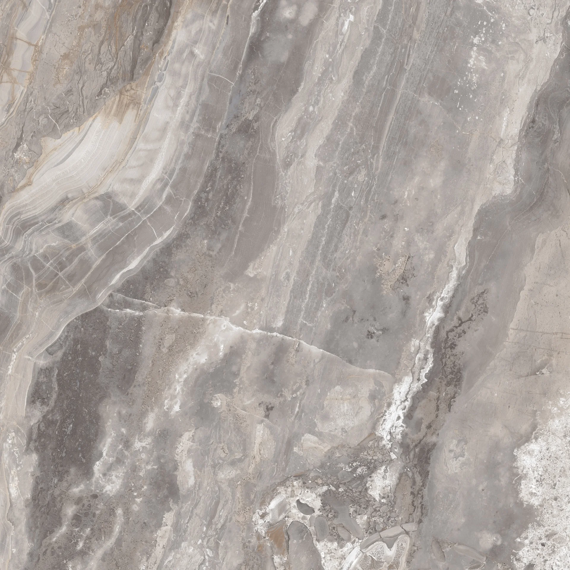 GRESIE OROBICO - 120X120 cm, porțelanată, în nuanțe de gri cu inserții bej și vene elegante, aspect de marmură naturală, finisaj super lucios high glossy, ideală pentru interioare sofisticate.