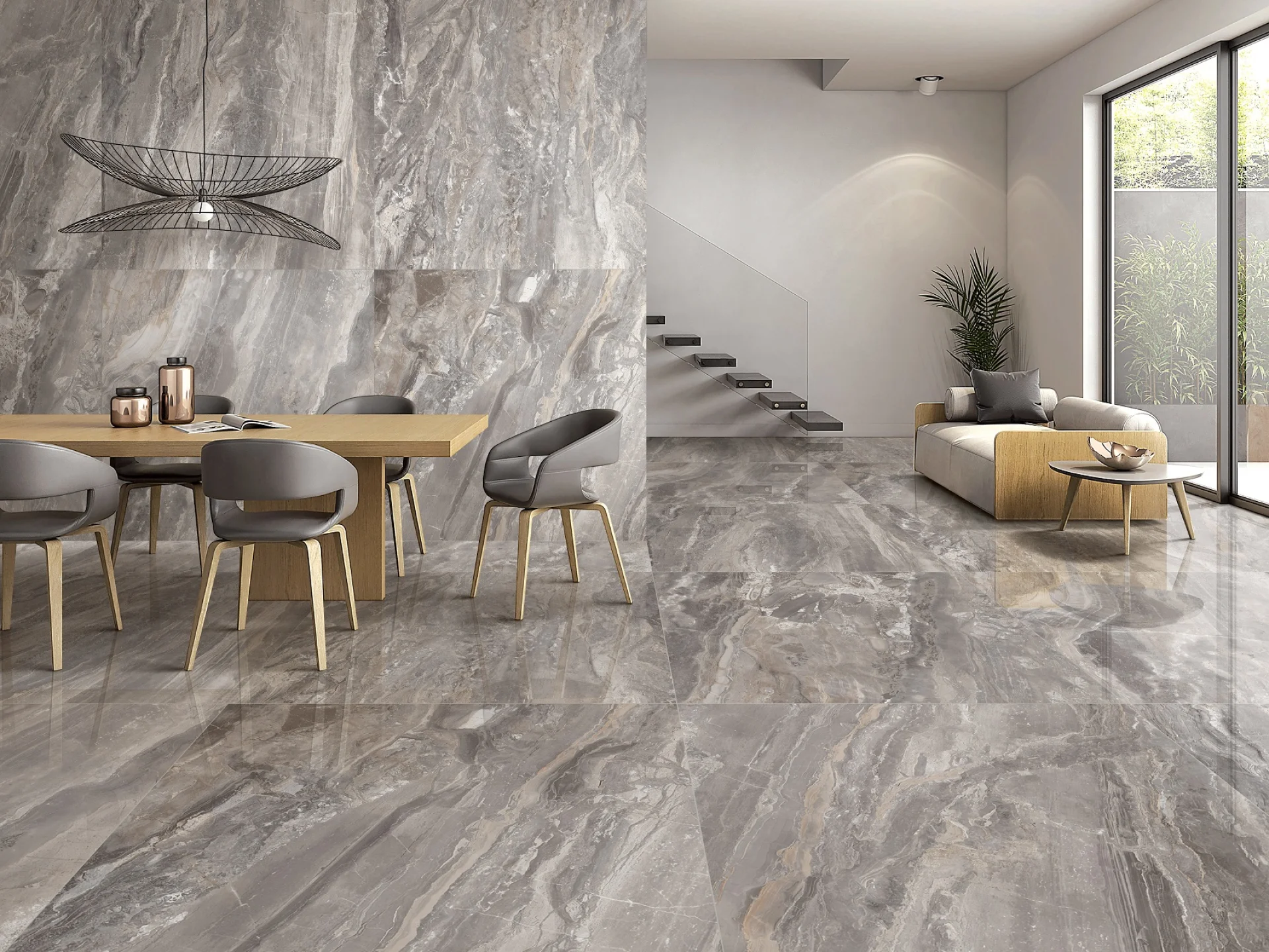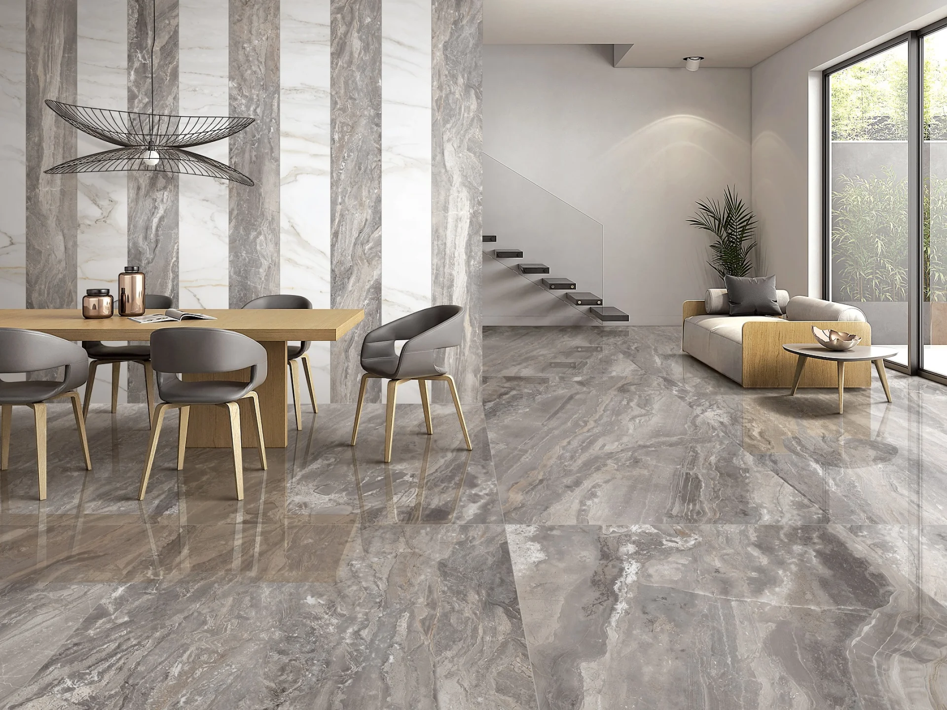 Plăcile mari, rectificate, permit o montare cu rosturi fine, obținându-se o suprafață continuă și modernă.