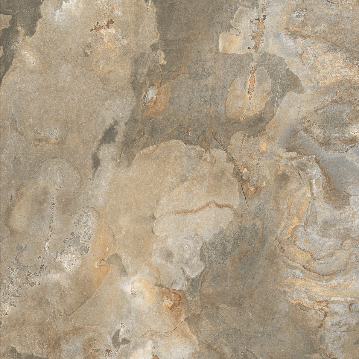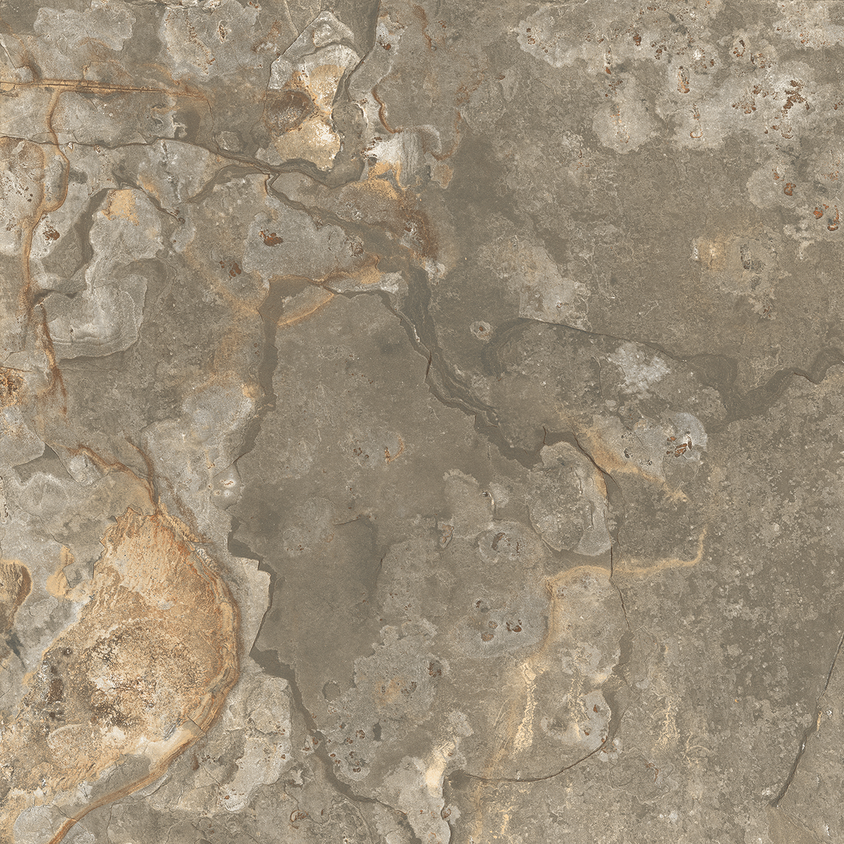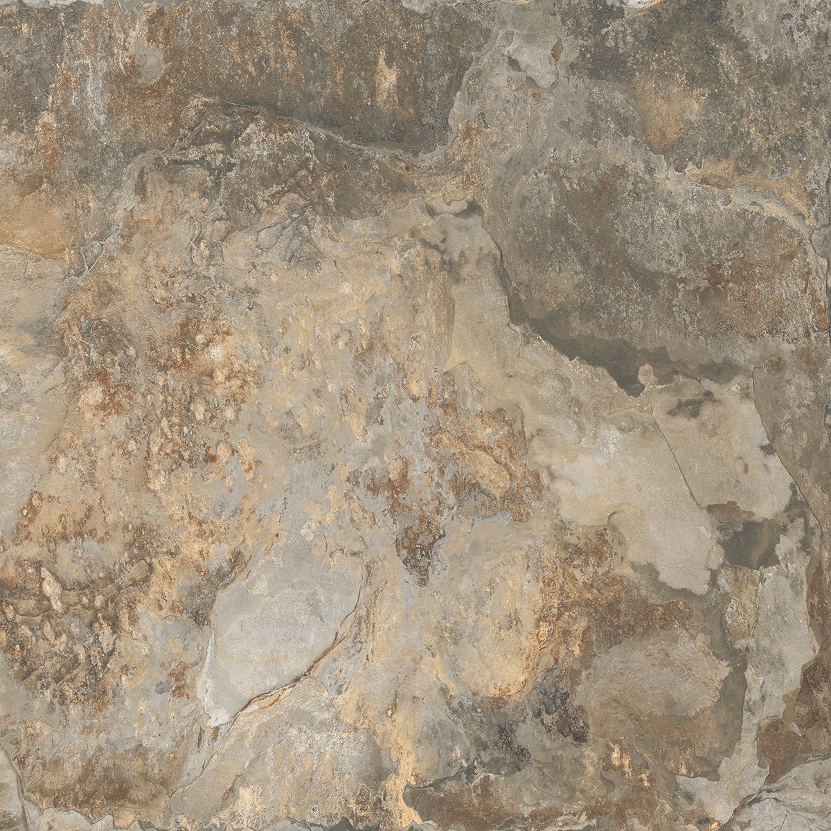 GRESIE LAVA VERDE - 60X60 cm, porțelanată, în nuanțe naturale de gri-verzui cu tonuri ruginii, cu aspect autentic de piatră naturală, finisaj mat rustic punch, potrivită pentru interior și exterior.
