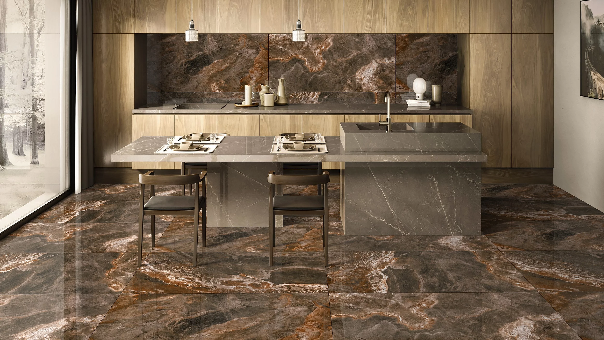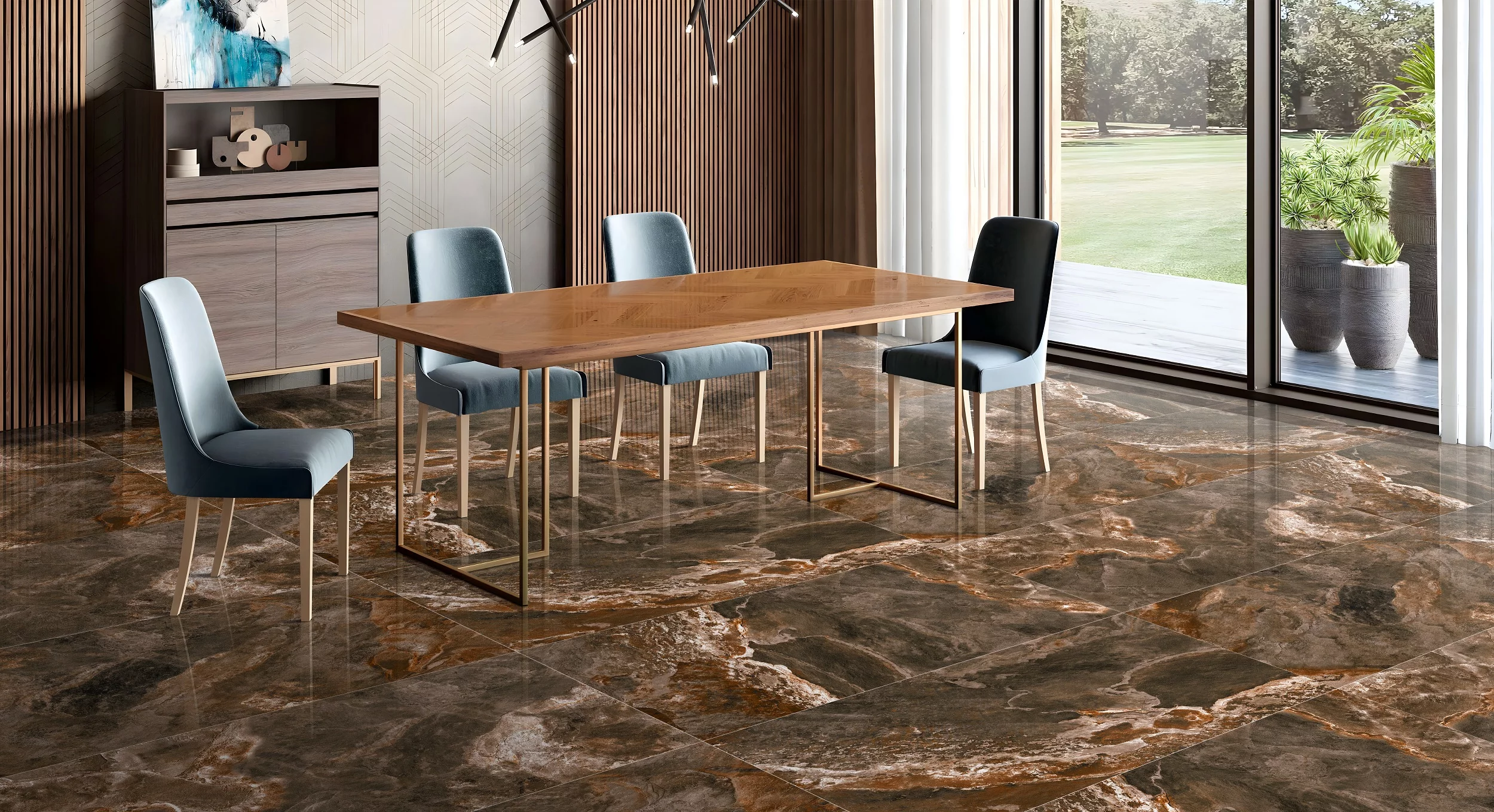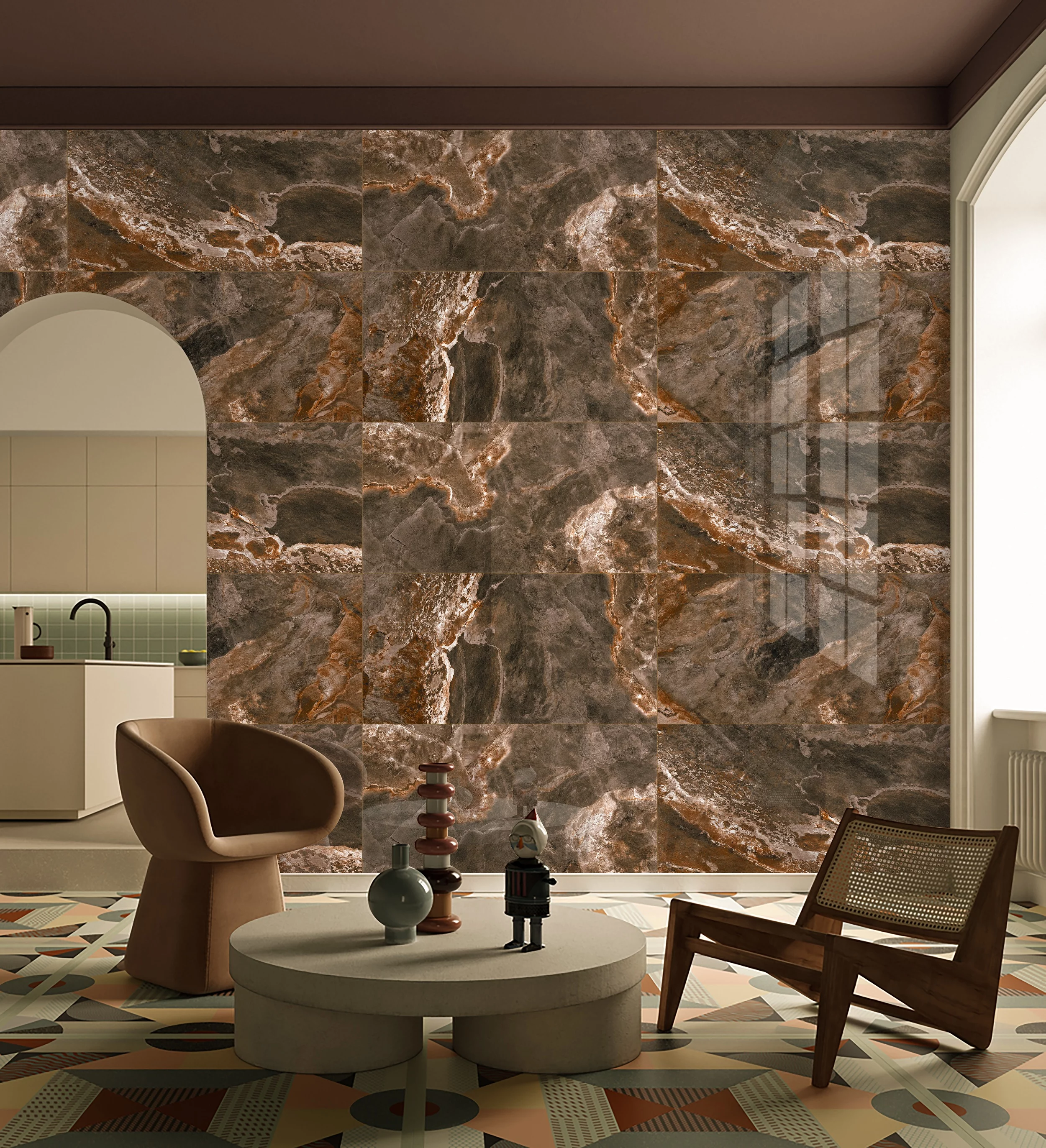 Jocul cromatic dintre maro intens, tonuri ruginii și nuanțe de pământ creează o atmosferă caldă, primitoare și deosebit de rafinată.