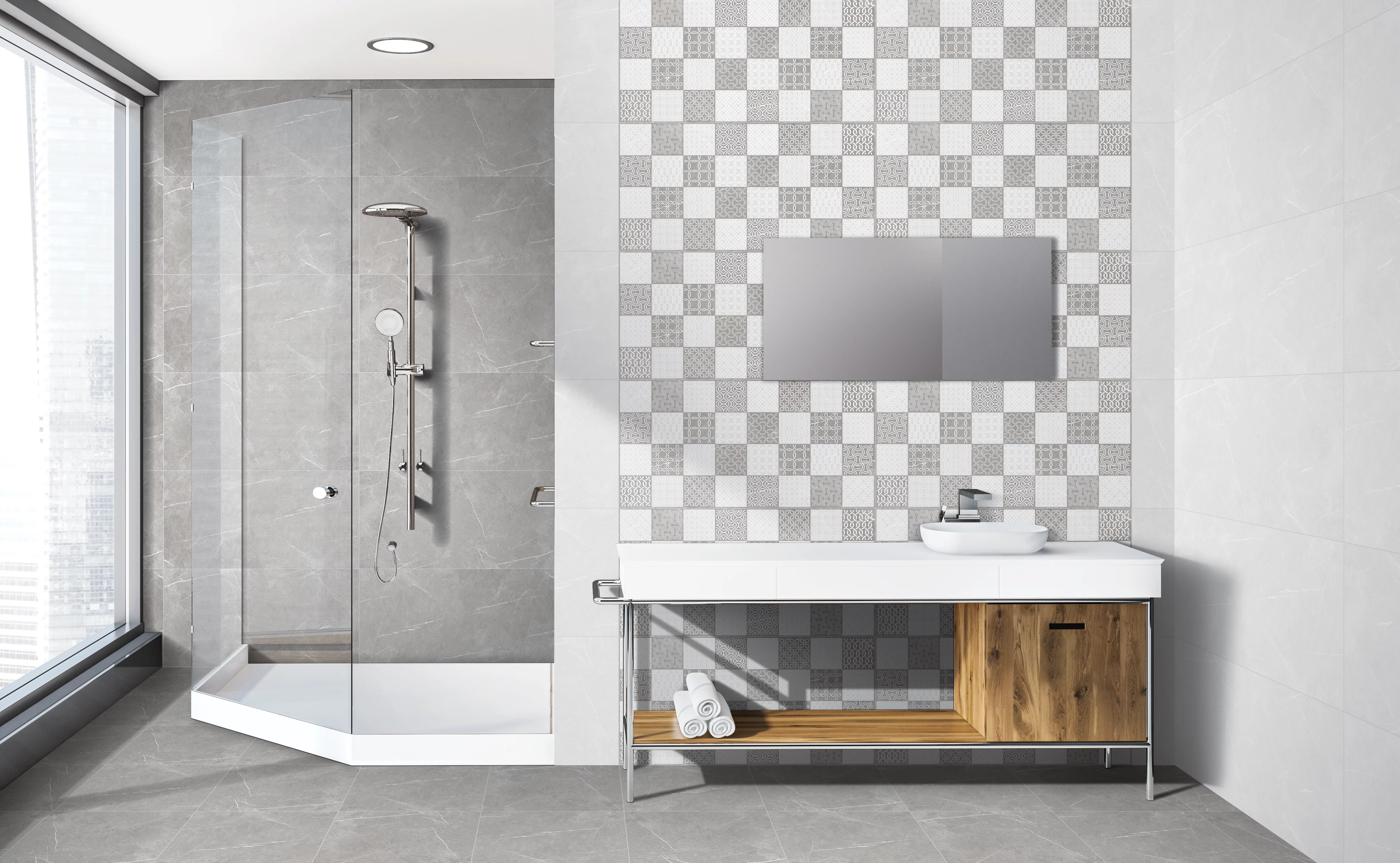 Datorită formatului generos de 40x80 cm și a graficii variate (RANDOM 4), creează un decor fluid și aerisit, ideal pentru băi sau bucătării.