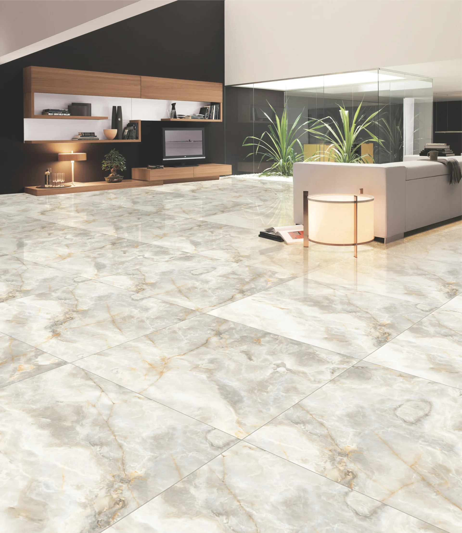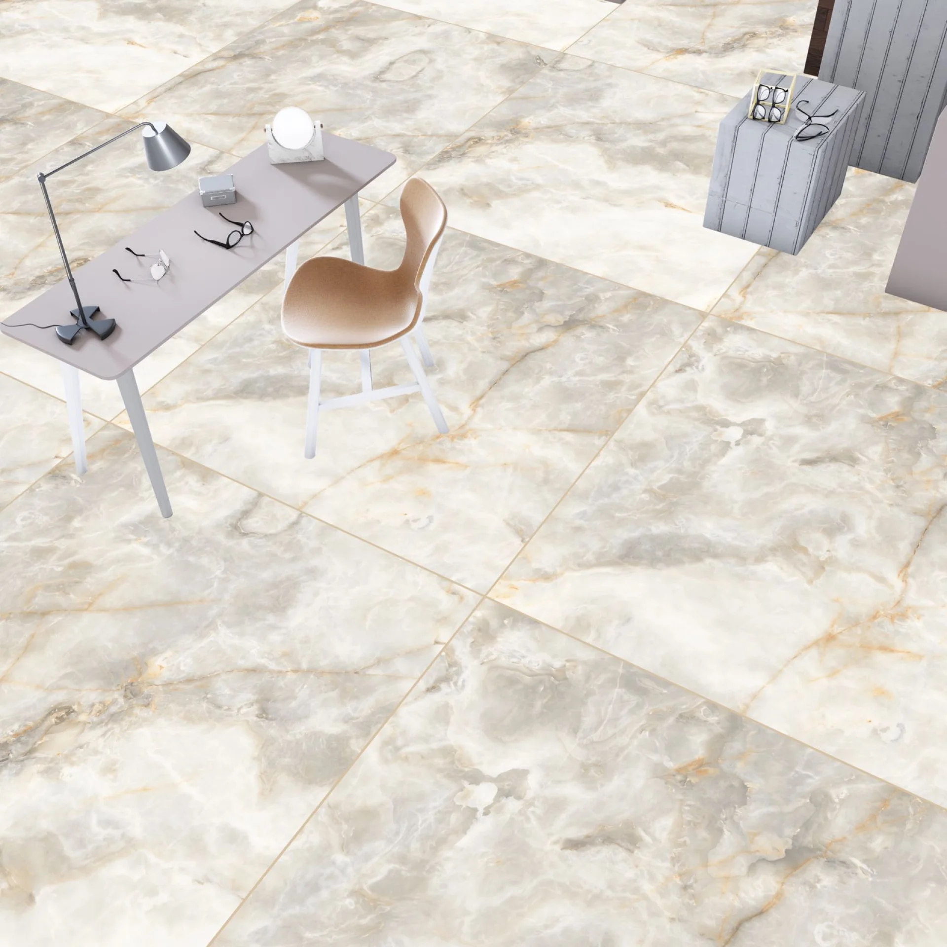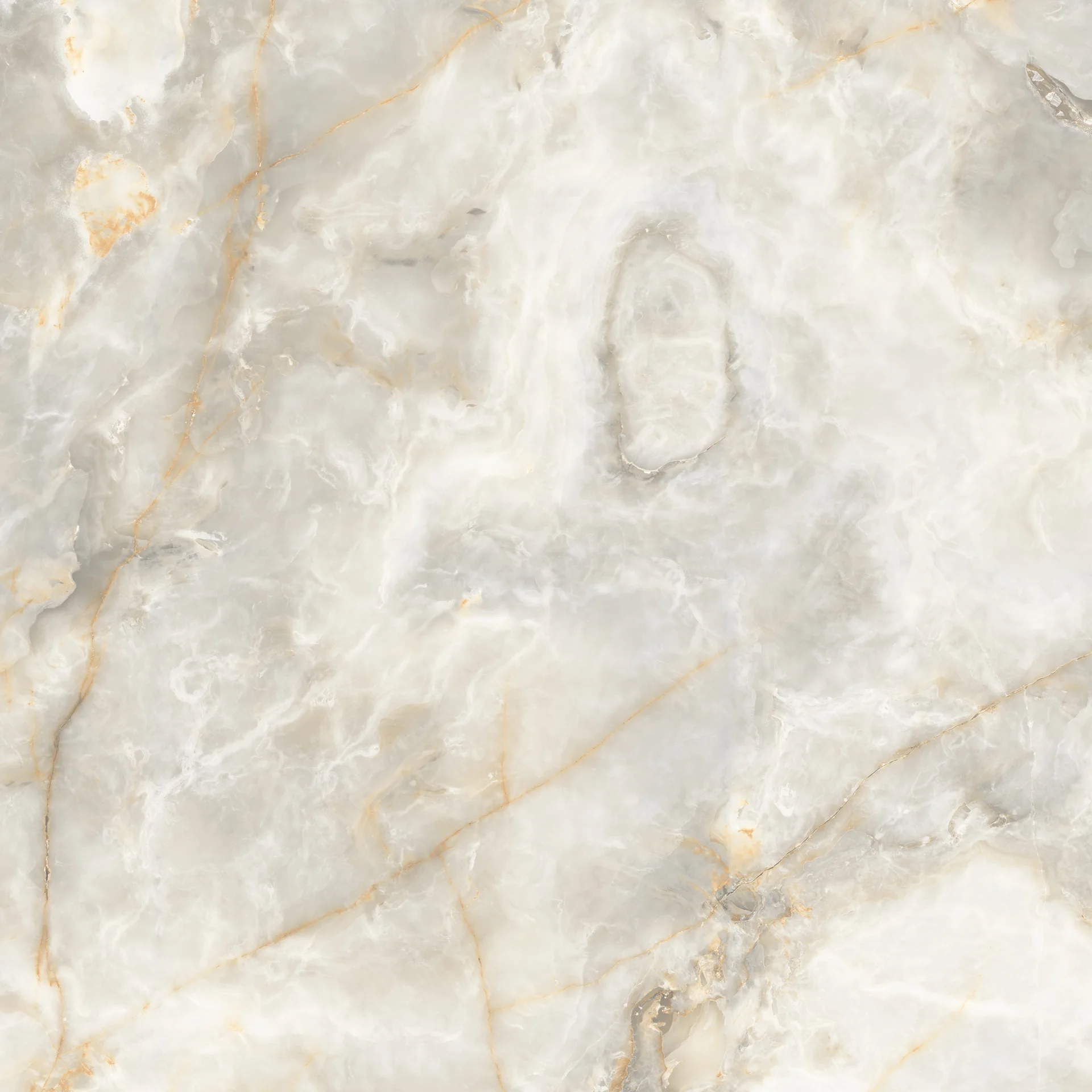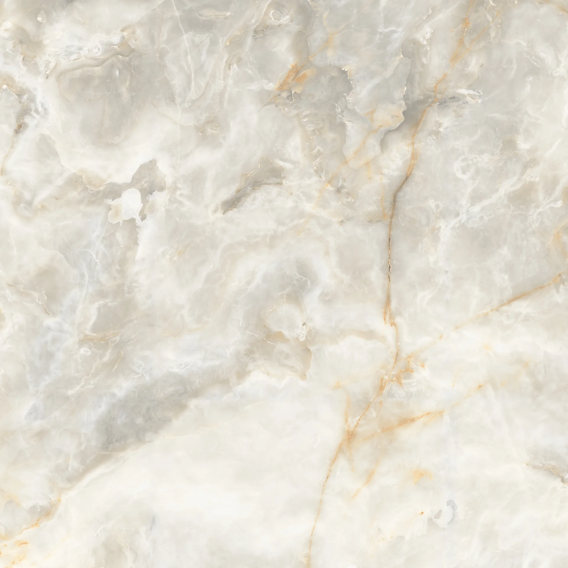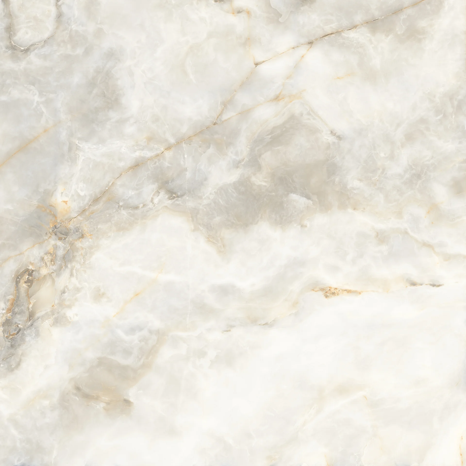 GRESIE ONYX DOVE - 120X120 cm, porțelanată, rectificată, glazurată, cu finisaj lucios, cu striații fine aurii, ideală pentru interioare rafinate.
