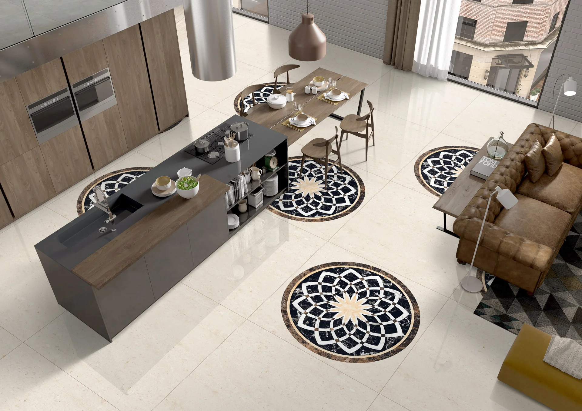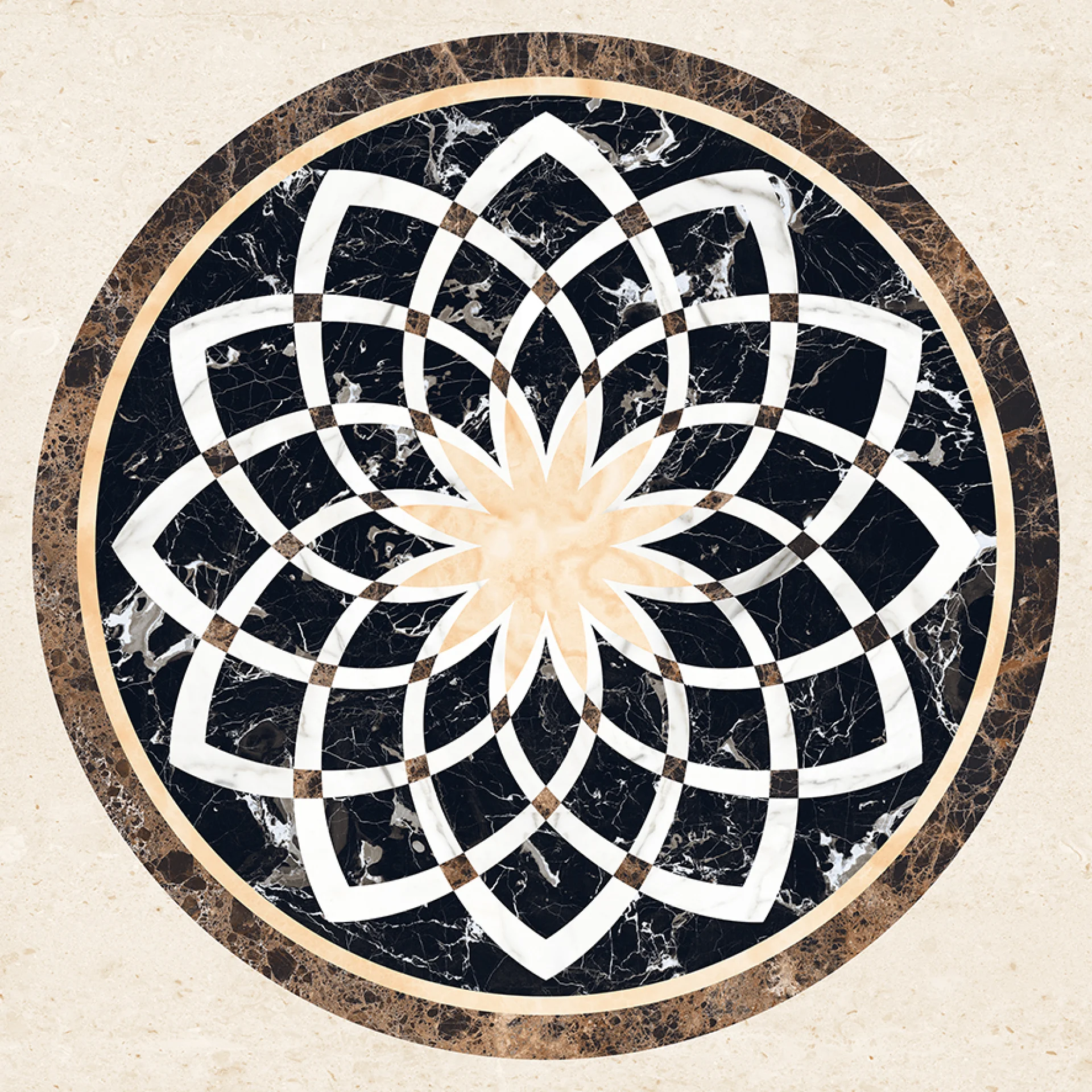 Designul său concentric în formă de floare stilizată combină nuanțe elegante de bej, alb, negru marmorat și maro, având un efect vizual sofisticat, asemănător mozaicului din marmură naturală.