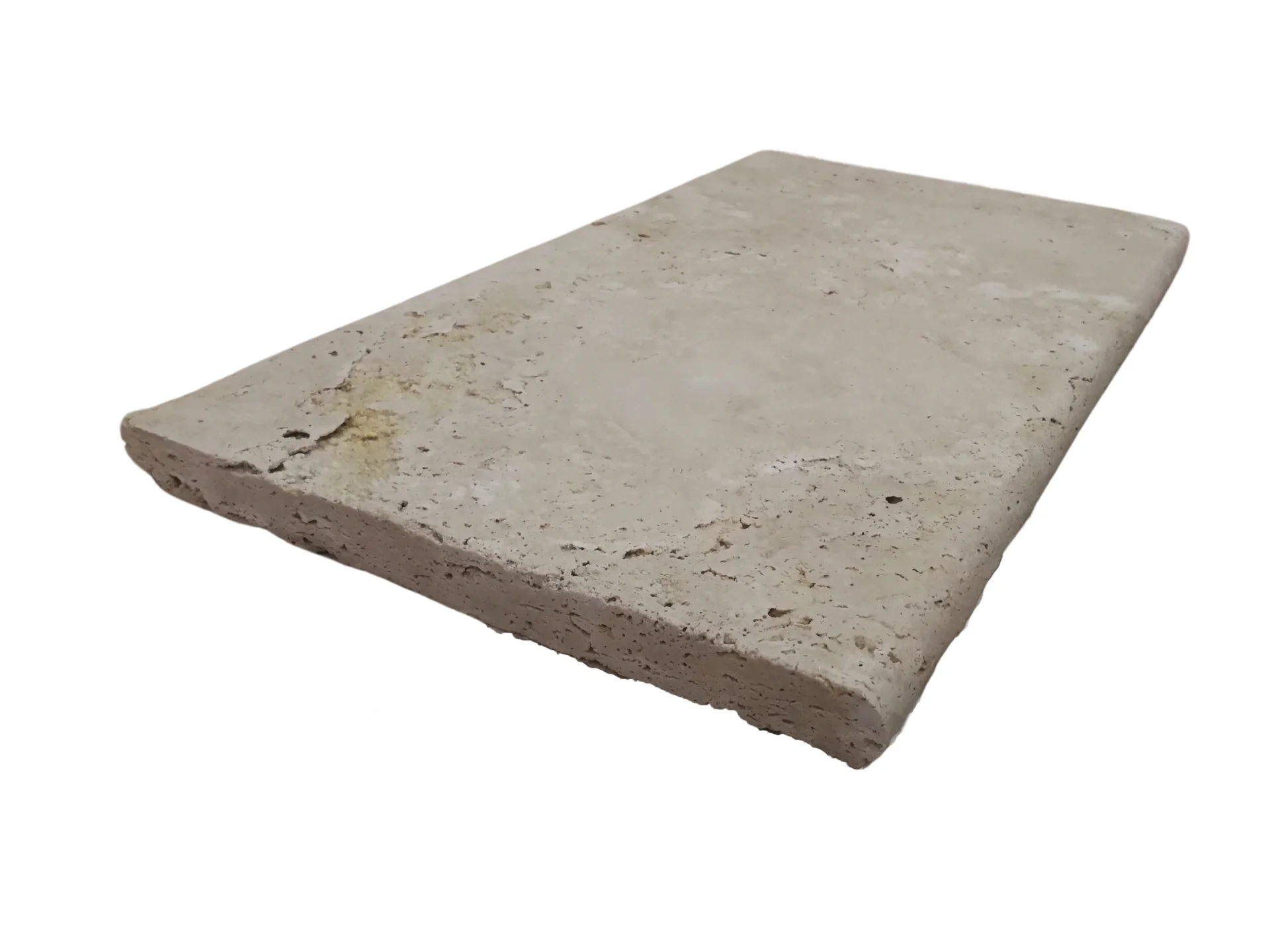TREAPTA TRAVERTIN ANTIQUE MIX BLEND - 33X61X3 cm, finisaj antichizat, natural nechituit, nuanțe bej-maronii calde, cu o margine rotunjită, ideală pentru spații rustice și clasice.