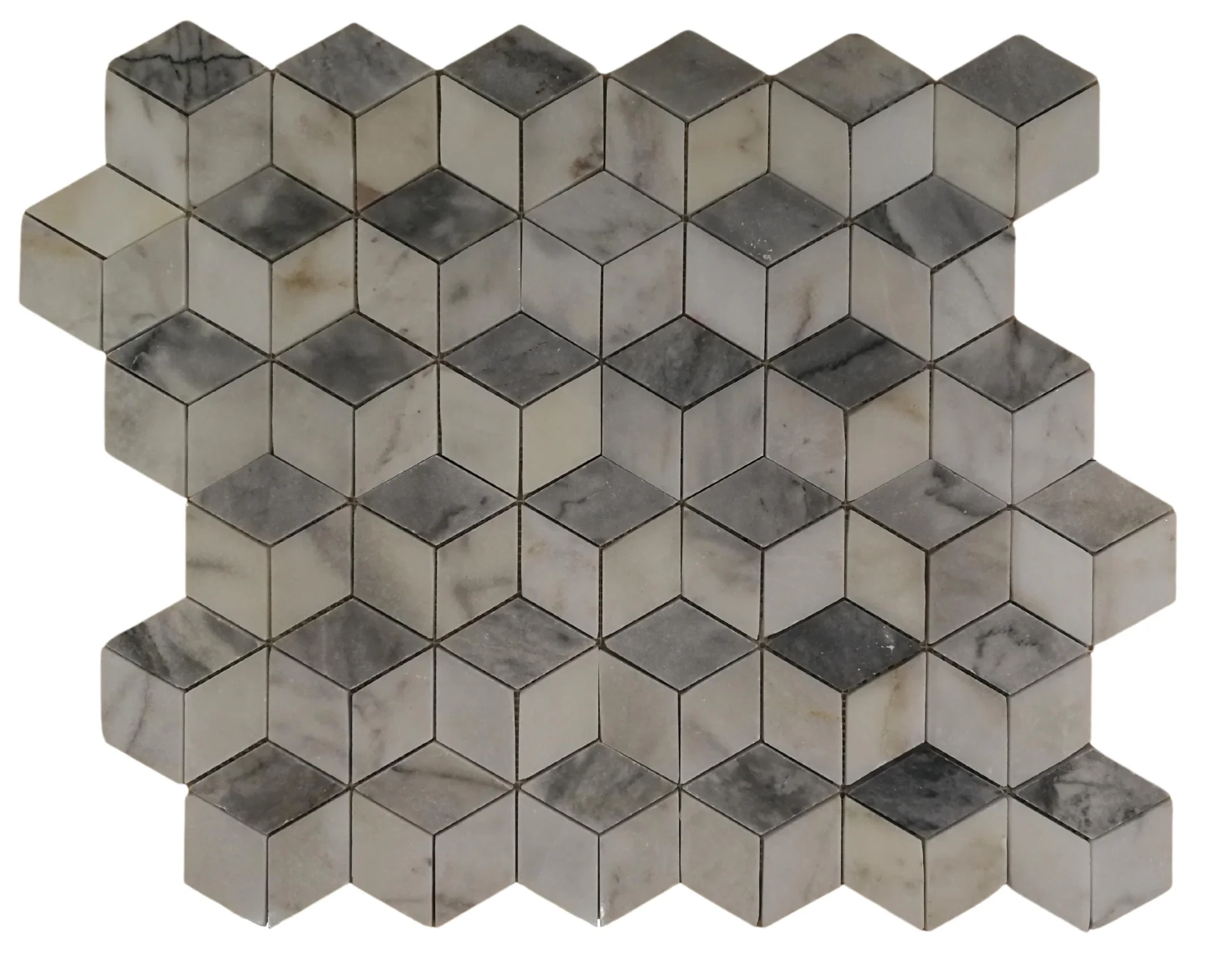 MOZAIC MARMURA DIAMOND WHITE-GREY - 30.5X26.6 cm, grosime 1 cm, alb-gri, finisaj lucios, un efect optic tridimensional spectaculos, ideal pentru interioare moderne.