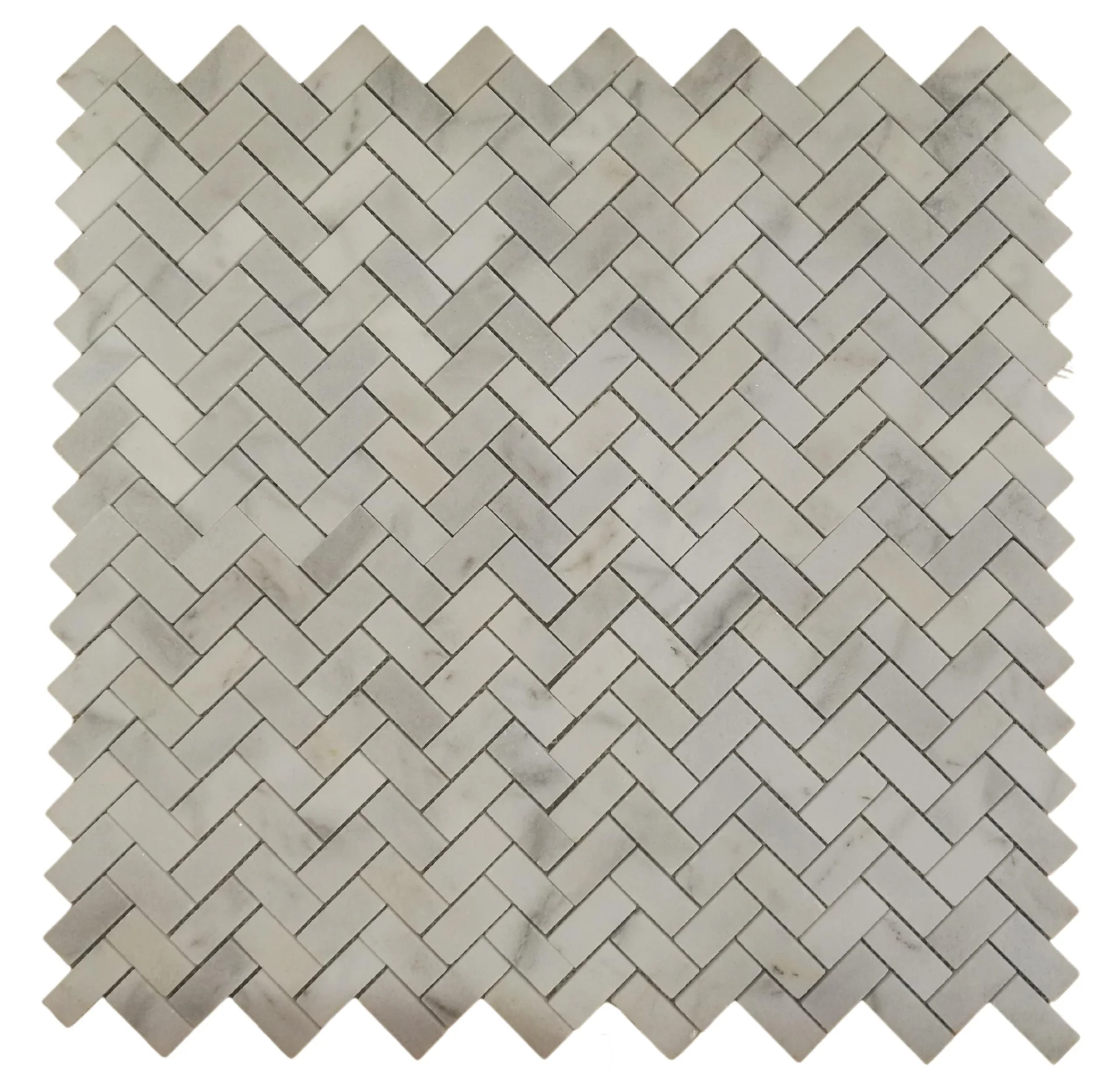 MOZAIC MARMURA HERRINGBONE WHITE - 29X29 cm, grosime 1 cm, model herringbone, alb cu venaturi discrete gri-bej, variații naturale subtile, finisaj lucios, ideal pentru interioare elegante și moderne.