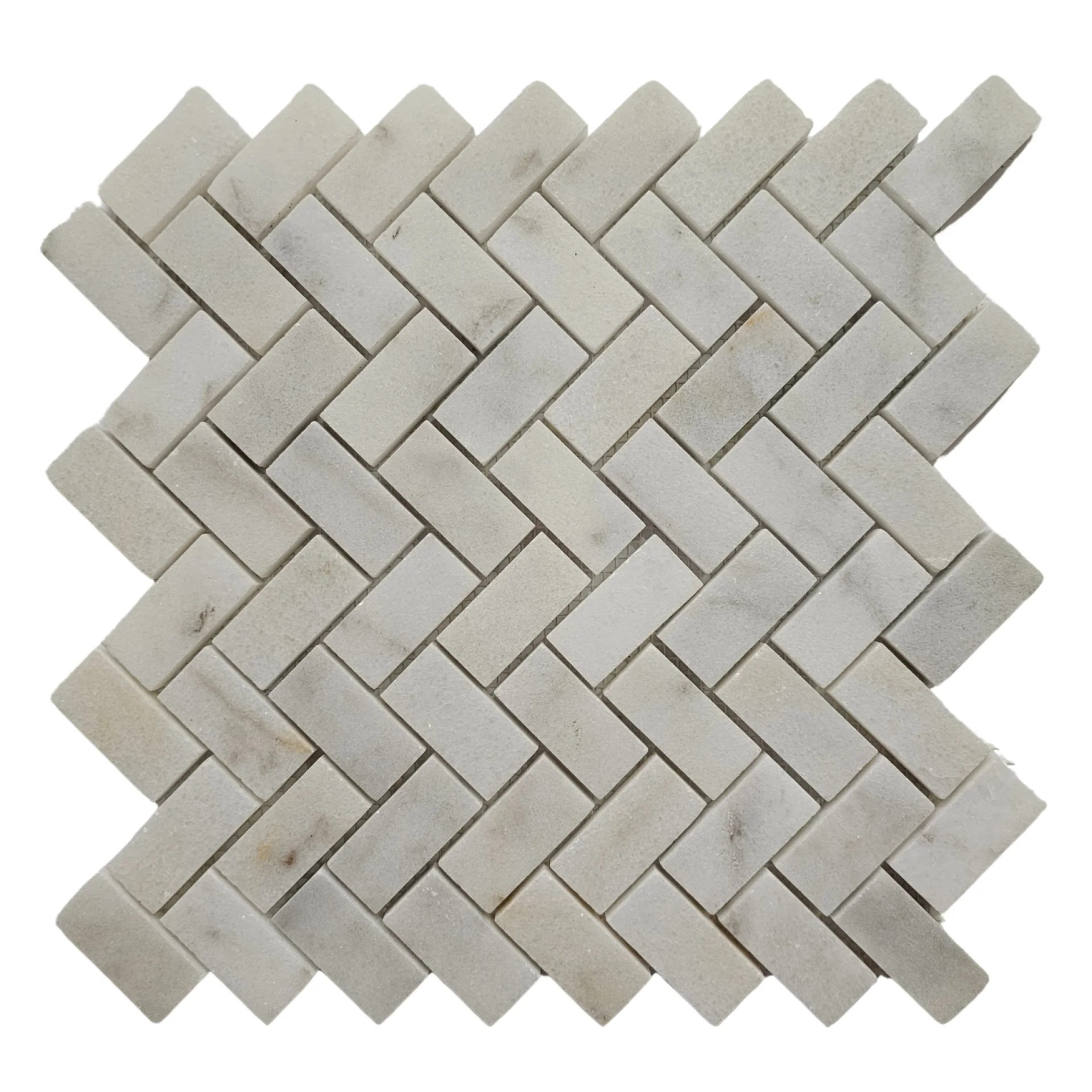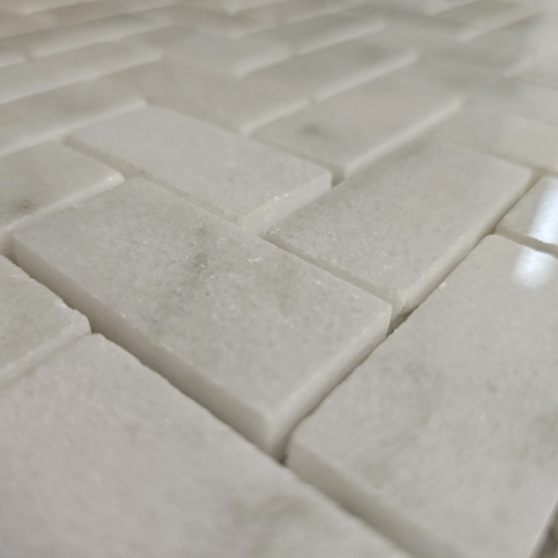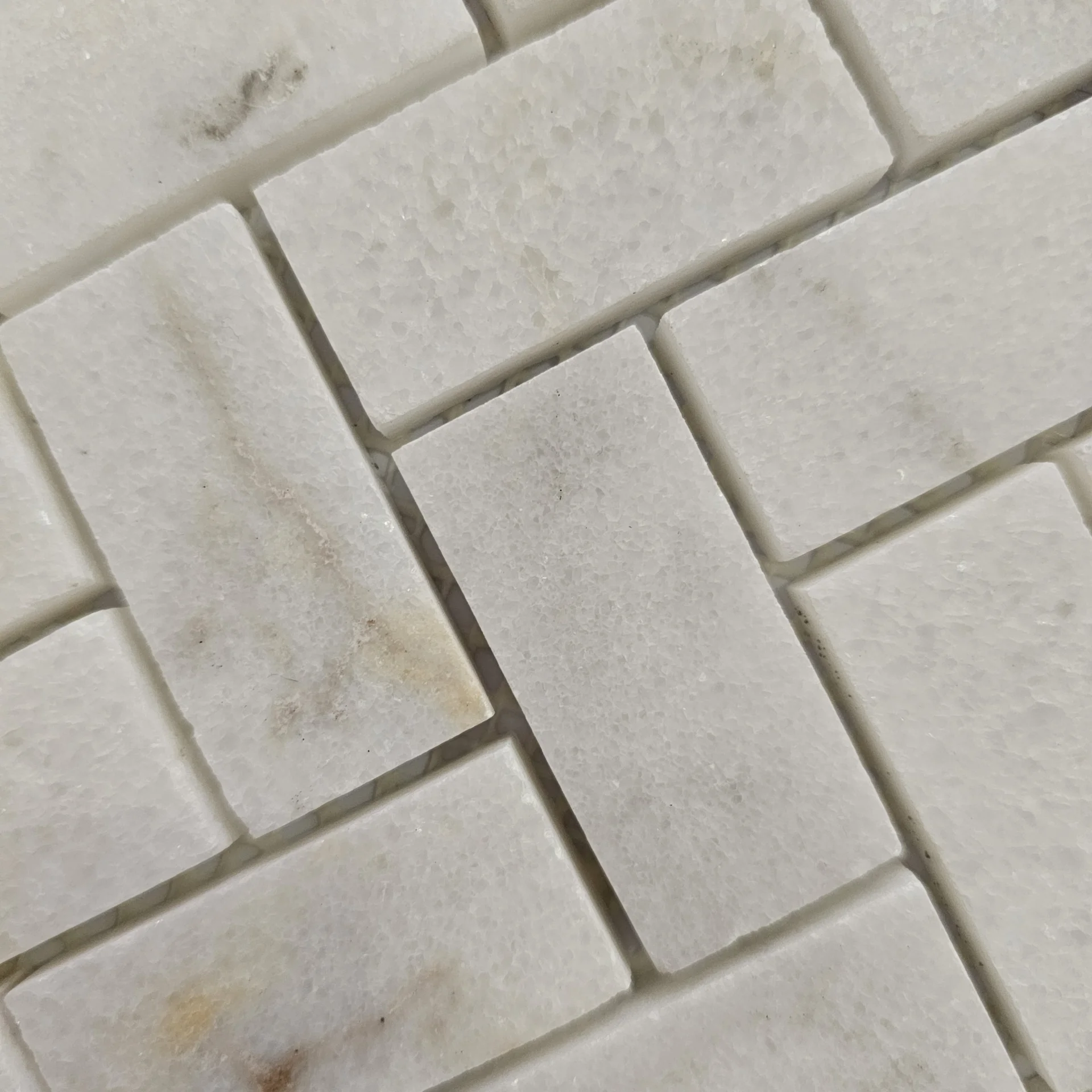 MOZAIC MARMURA HERRINGBONE WHITE din marmură naturală aduce rafinament și textură spațiilor interioare printr-un model clasic „spic de grâu” (herringbone).