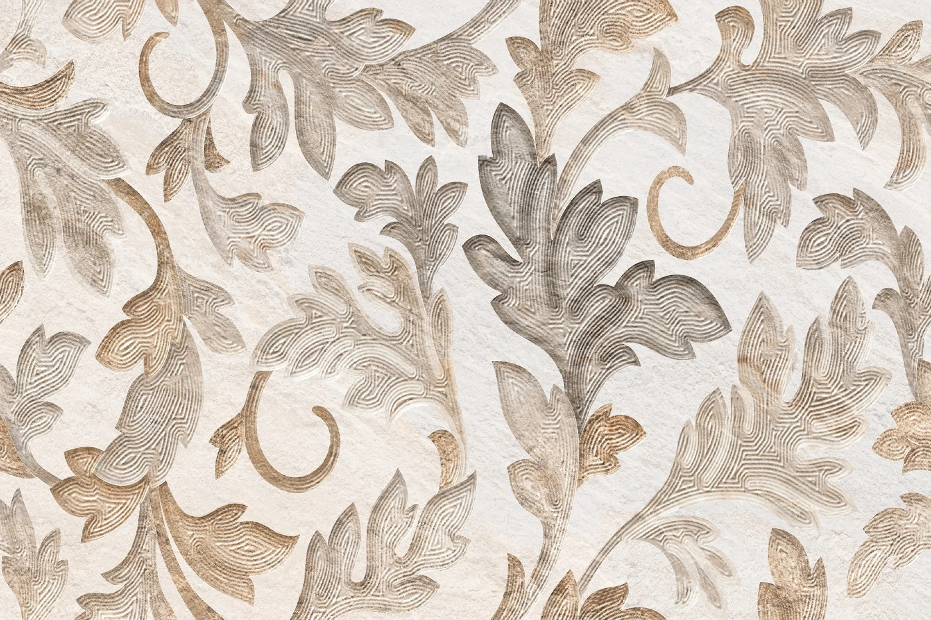 Cu un design floral reliefat, în nuanțe calde de bej și maro, această placă ceramică rectificată oferă un contrast subtil pe fondul texturat cu finisaj lucios.