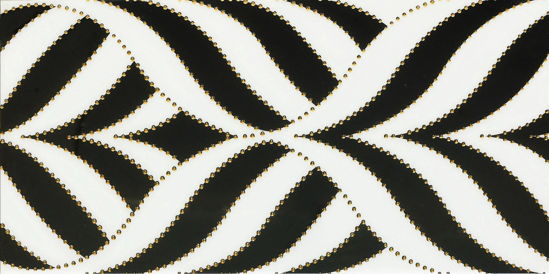 PLACA DECOR FAIANTA FC-36PH1483-GOLD aduce un plus de personalitate și eleganță în orice spațiu interior, datorită modelului geometric din valuri negre, conturat cu puncte aurii în relief.