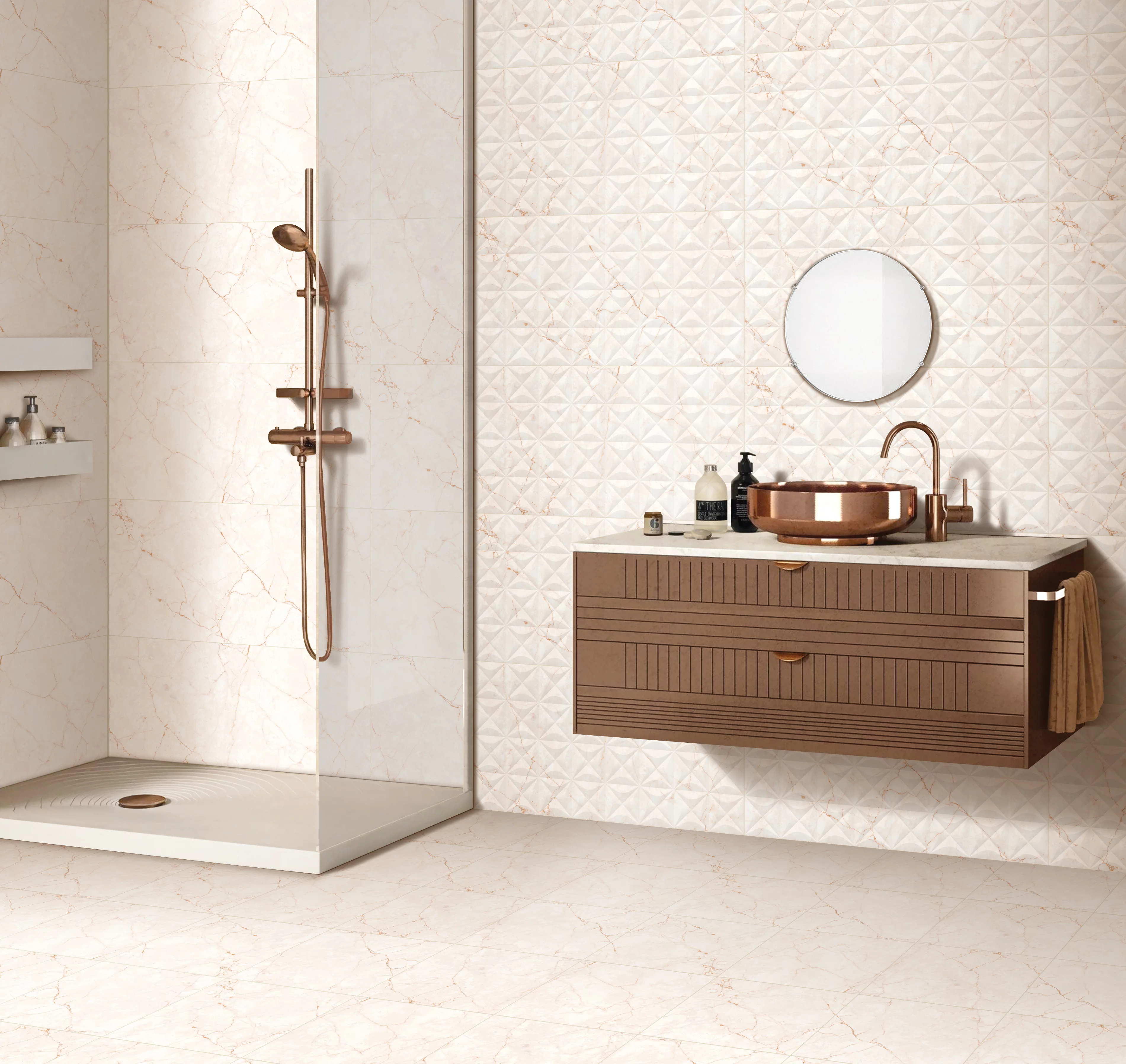 Designul său inspirat din marmura naturală, cu nervuri fine și variații subtile de tonuri bej deschis, este accentuat de un finisaj satinat mat combinat cu detalii lucioase, efectul special „luster” oferă profunzime și luminozitate plăcii.
