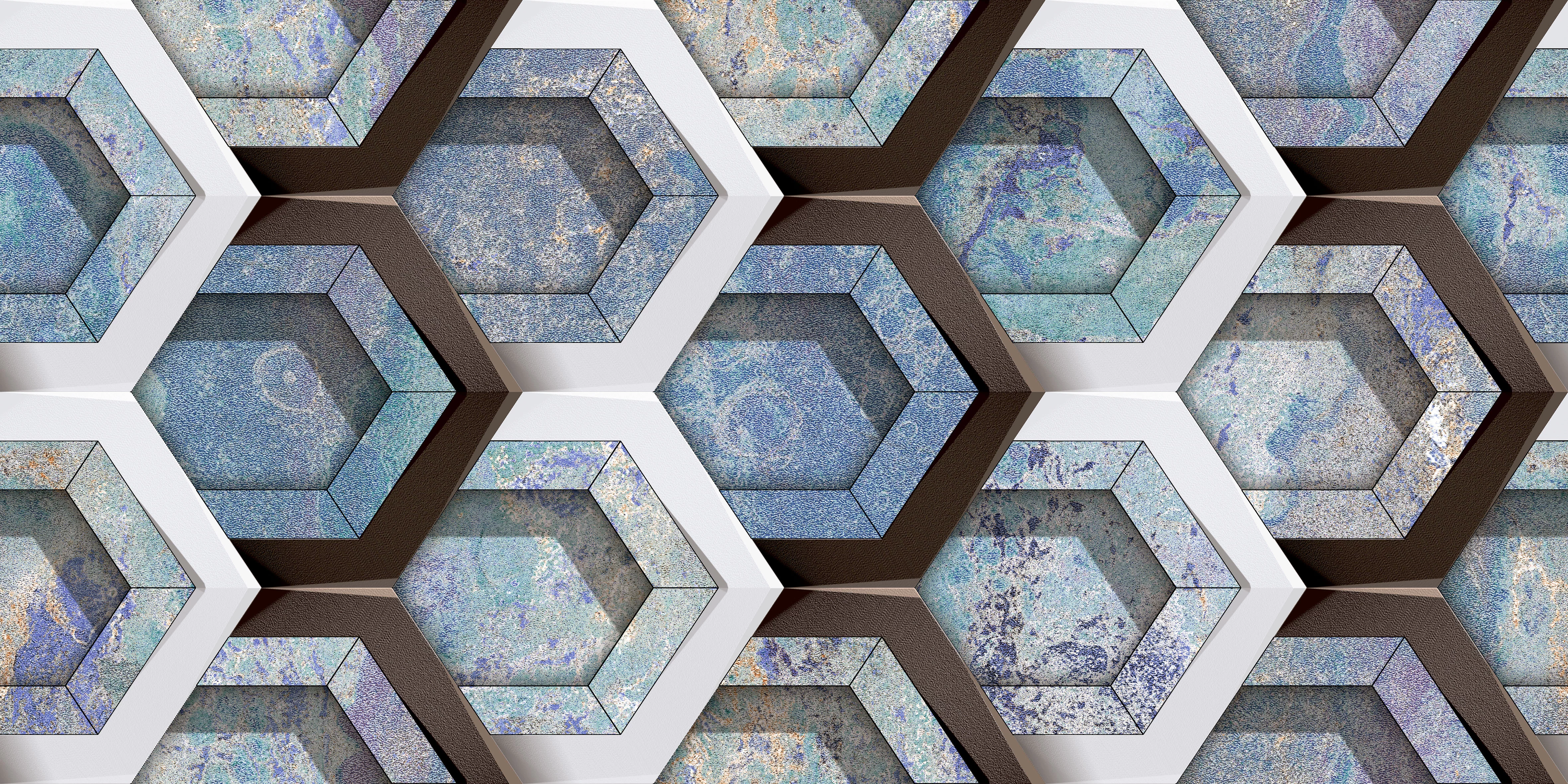 FAIANTA S NUVOLO AZURE HL - 30X60 cm, ceramica glazurata, rectificata, suprafata granulata, finisaj sugar, se evidențiază printr-un design tridimensional spectaculos, cu un model geometric compus din hexagoane adâncite, în nuanțe de albastru, verde și accente ruginii. Jocul de volume și culori conferă dinamism și profunzime vizuală, fiind ideal pentru pereți accent sau decoruri contemporane.
