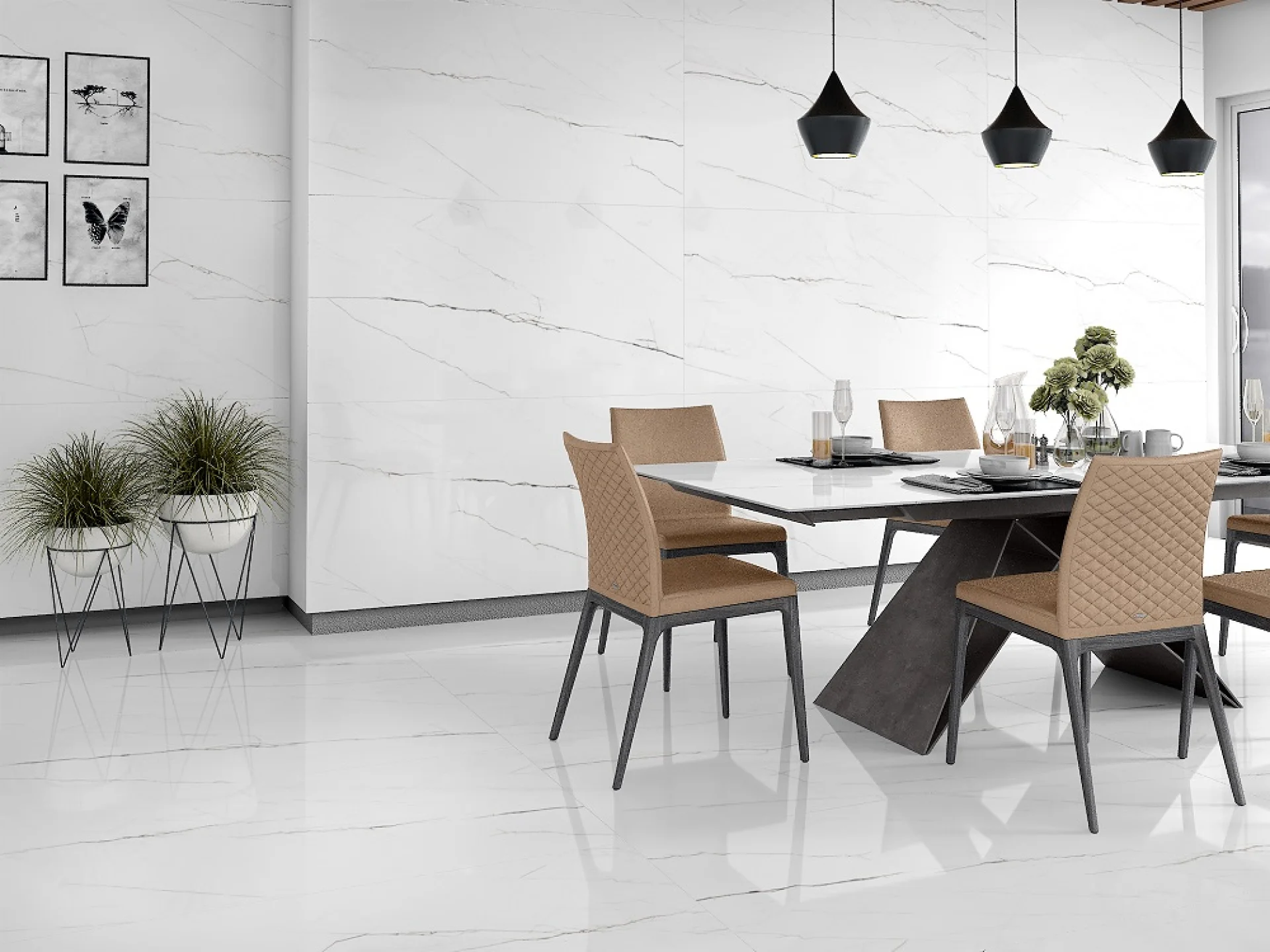 Finisajul lucios intensifică senzația de eleganță, iar dimensiunea generoasă a plăcii creează impresia de continuitate.