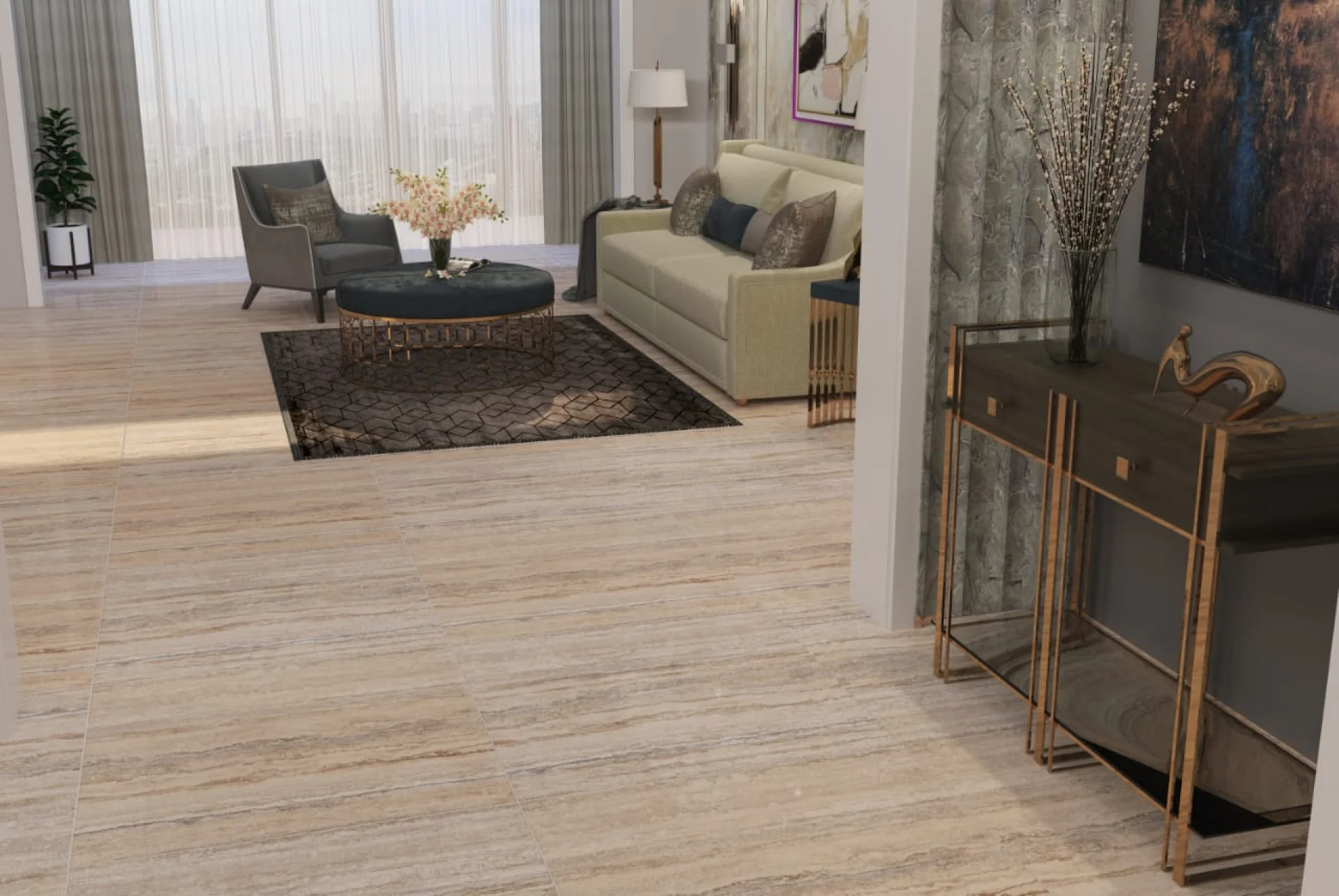 Aspectul imită textura travertinului, aducând o notă sofisticată și caldă în orice spațiu.