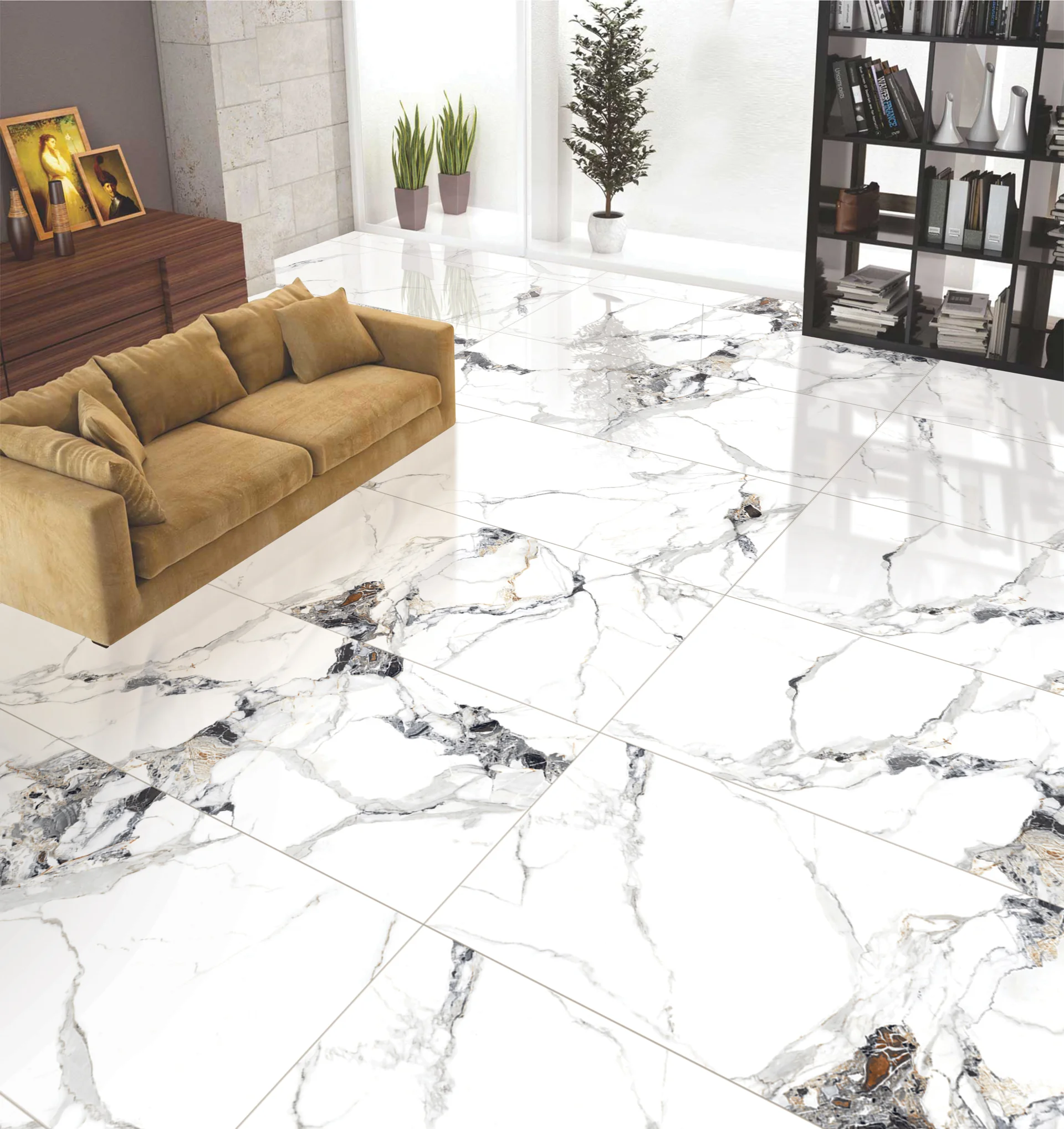 PORTELANATA, GLAZURATA, RECTIFICATA, INTERIOR-EXTERIOR, LUCIOASA, ALB CU INSERTII NEGRE, IMITATIE MARMURA RANDOM 4, RATA DE ABSORBTIE A APEI 0.06%, PEI III , COMPATIBILA CU SISTEME DE INCALZIRE IN PARDOSEALA